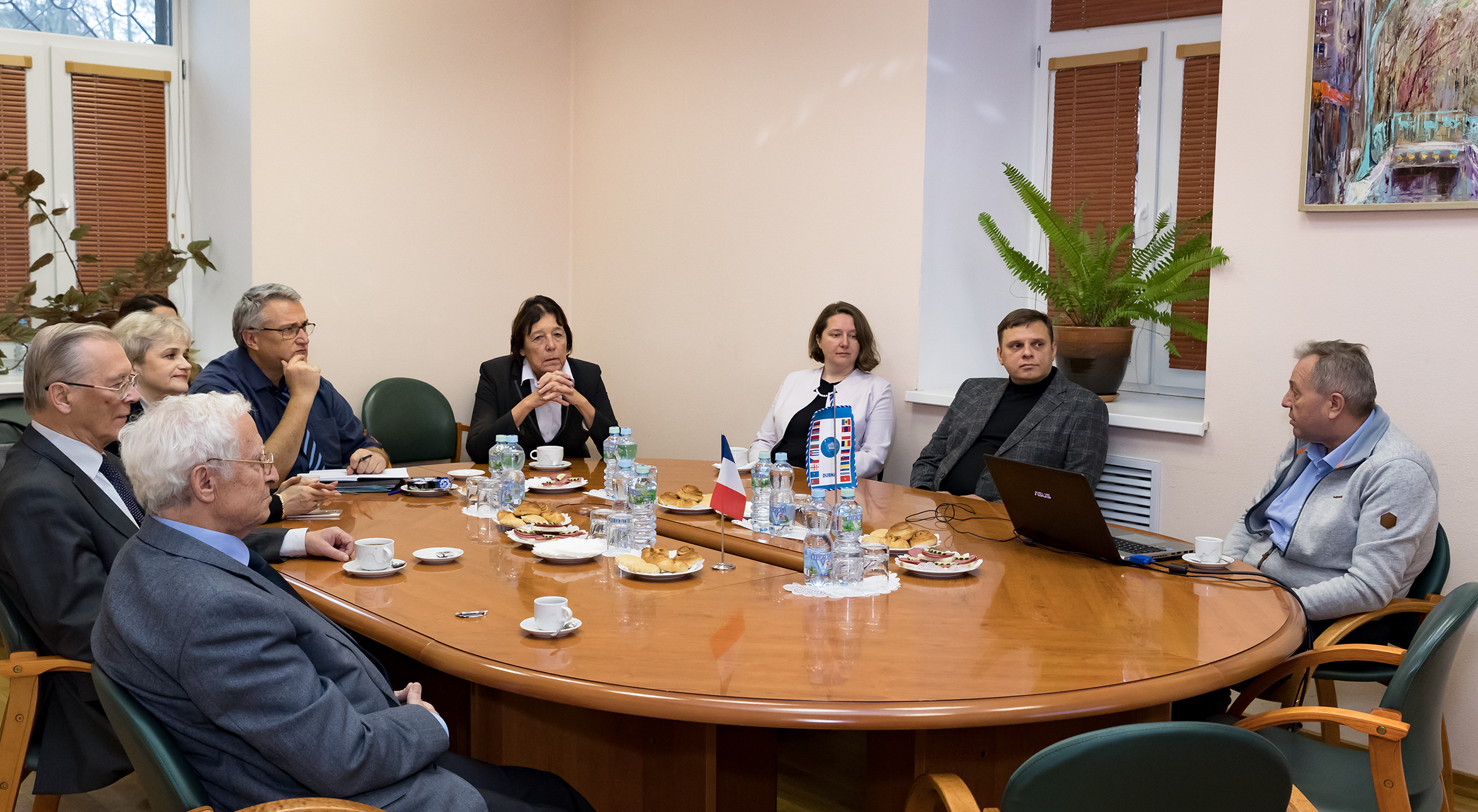 Mme Bréchignac in her trip to Dubna was accompanied by Dr Gael Moullec, Advisor on cooperation with Russia and the Eurasian region to the Academy of Sciences of France. JINR Director V. A. Matveev and JINR Vice-Director M. G. Itkis welcomed the French delegation and briefly introduced to the guests today’s JINR, its new projects and scientific results achieved since the last visit of Mme Bréchignac to Dubna, as well as progress in cooperation between JINR and French scientific organizations.