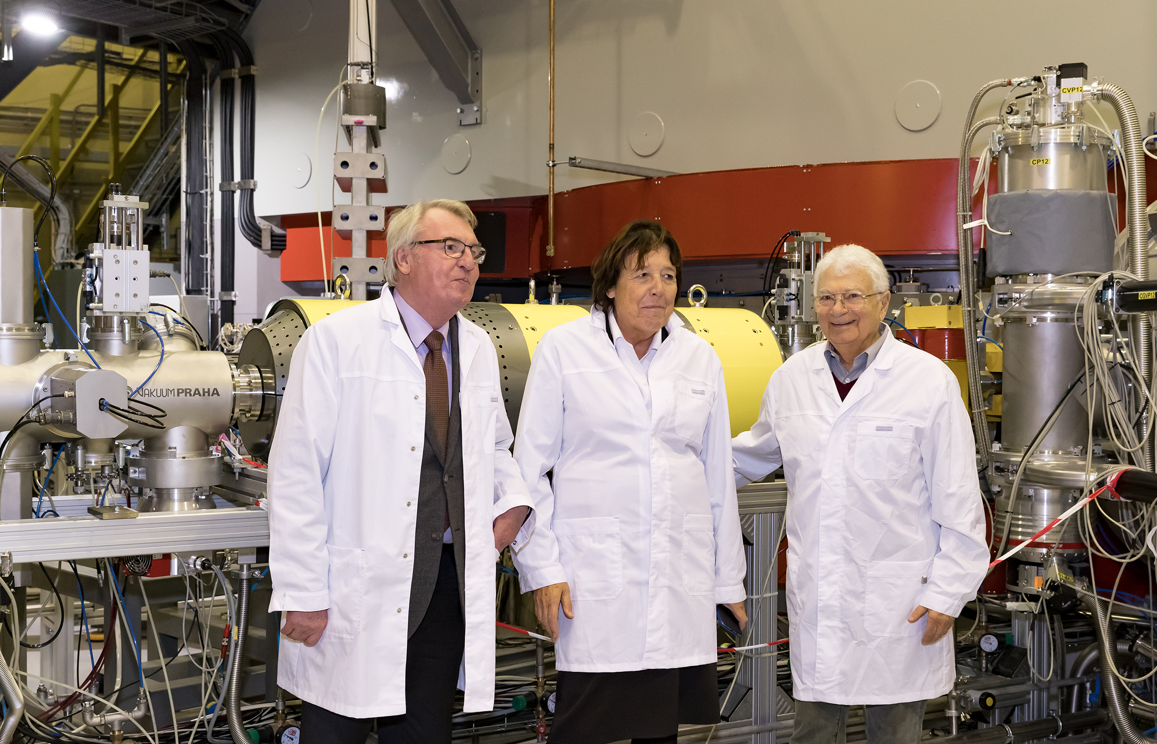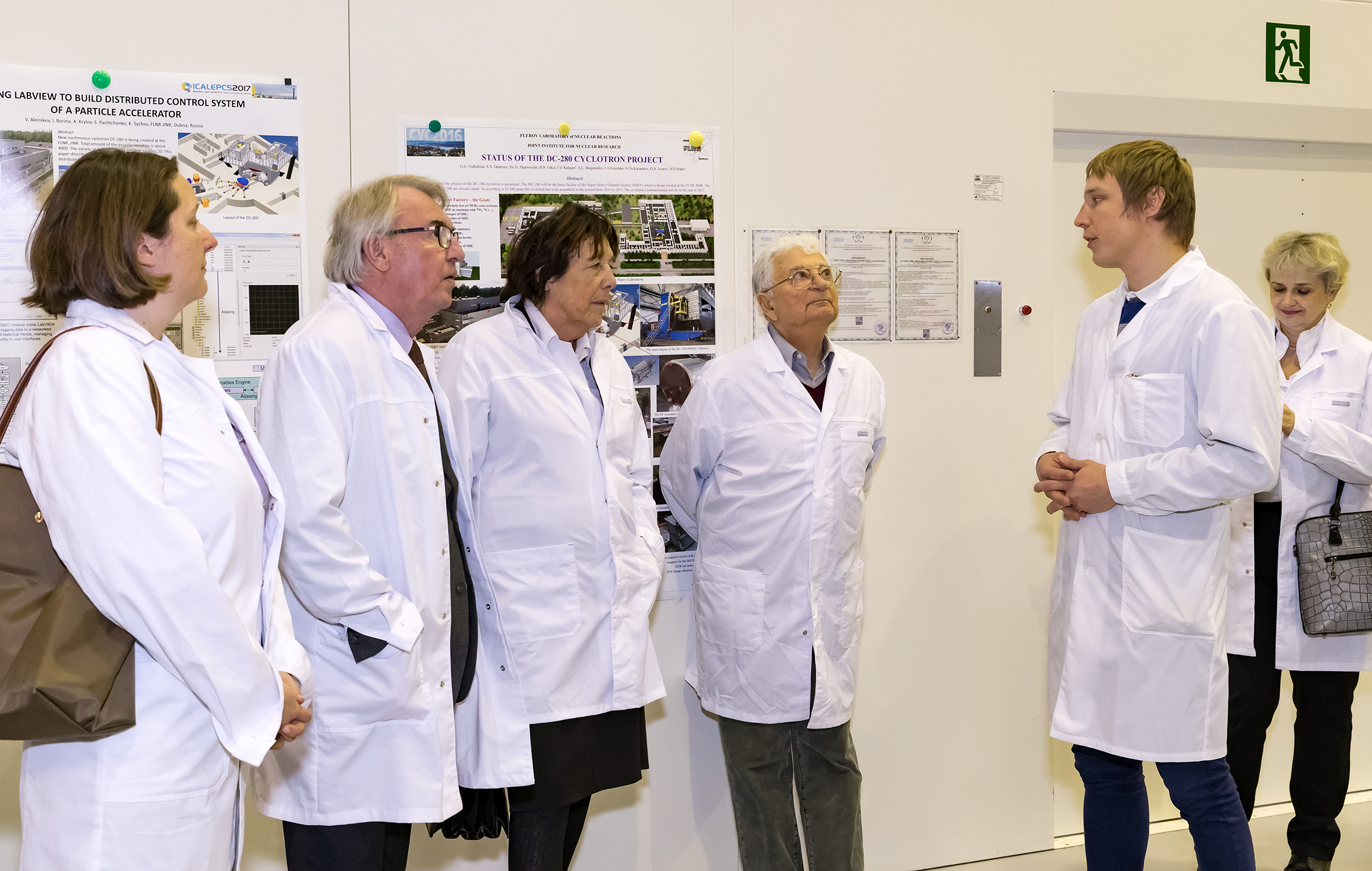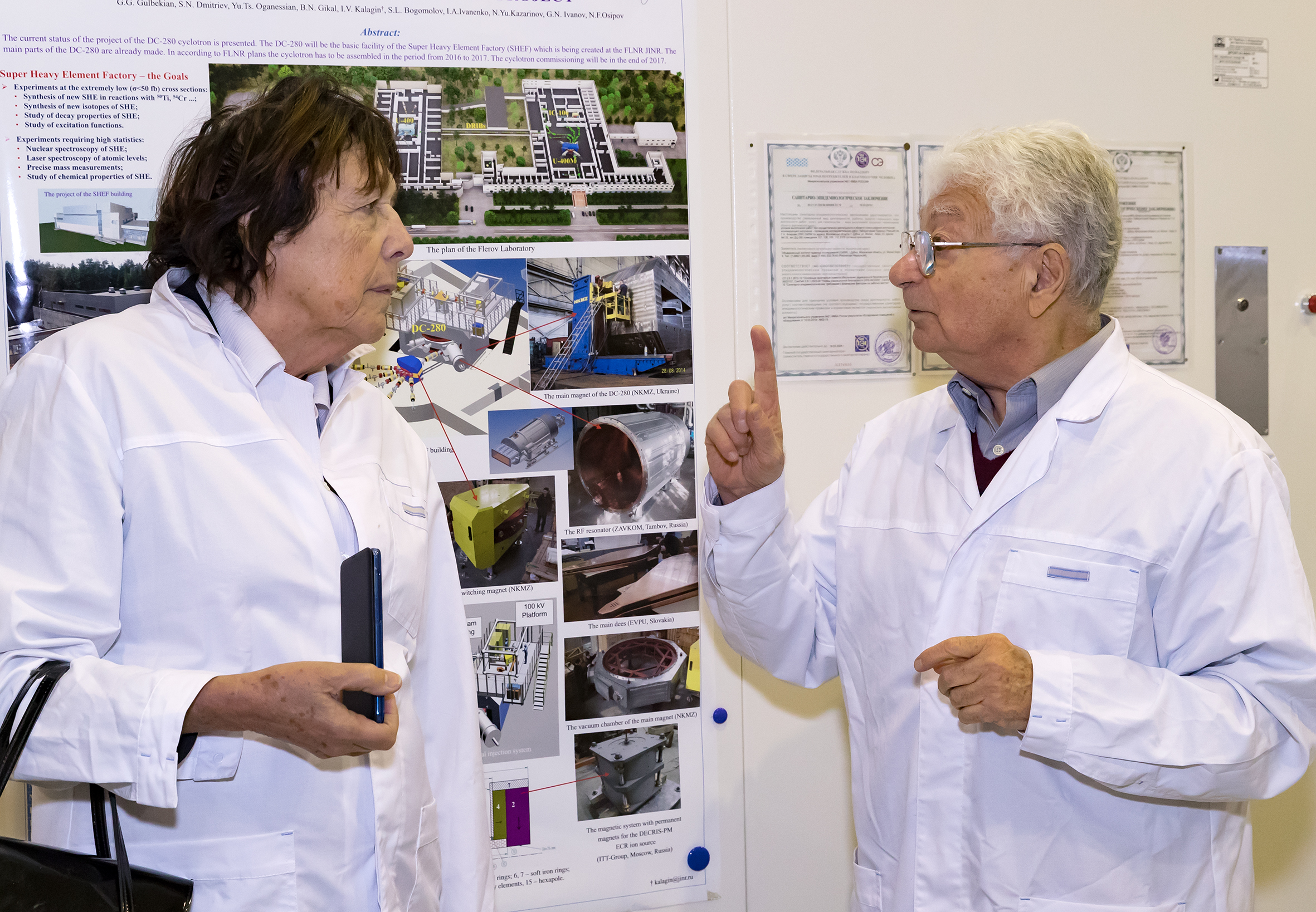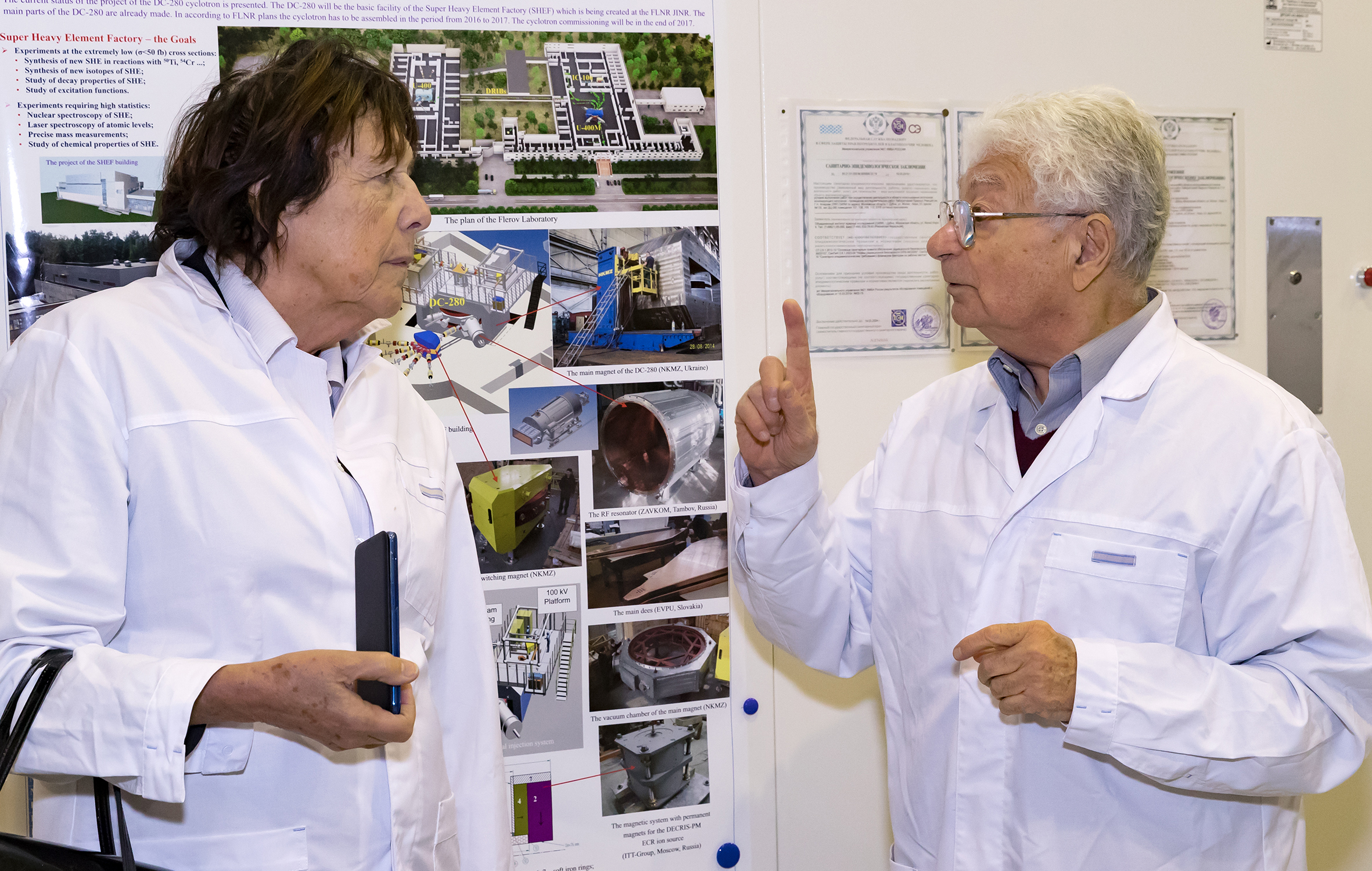 FLNR Director S. N. Dmitriev and FLNR Scientific Leader Yu. Ts. Oganessian guided a tour around the Superheavy Element Factory. They spoke about opportunities of the DC-280 cyclotron – the heart of the Factory – for research and new discoveries in the fields of heavy and exotic nuclei.