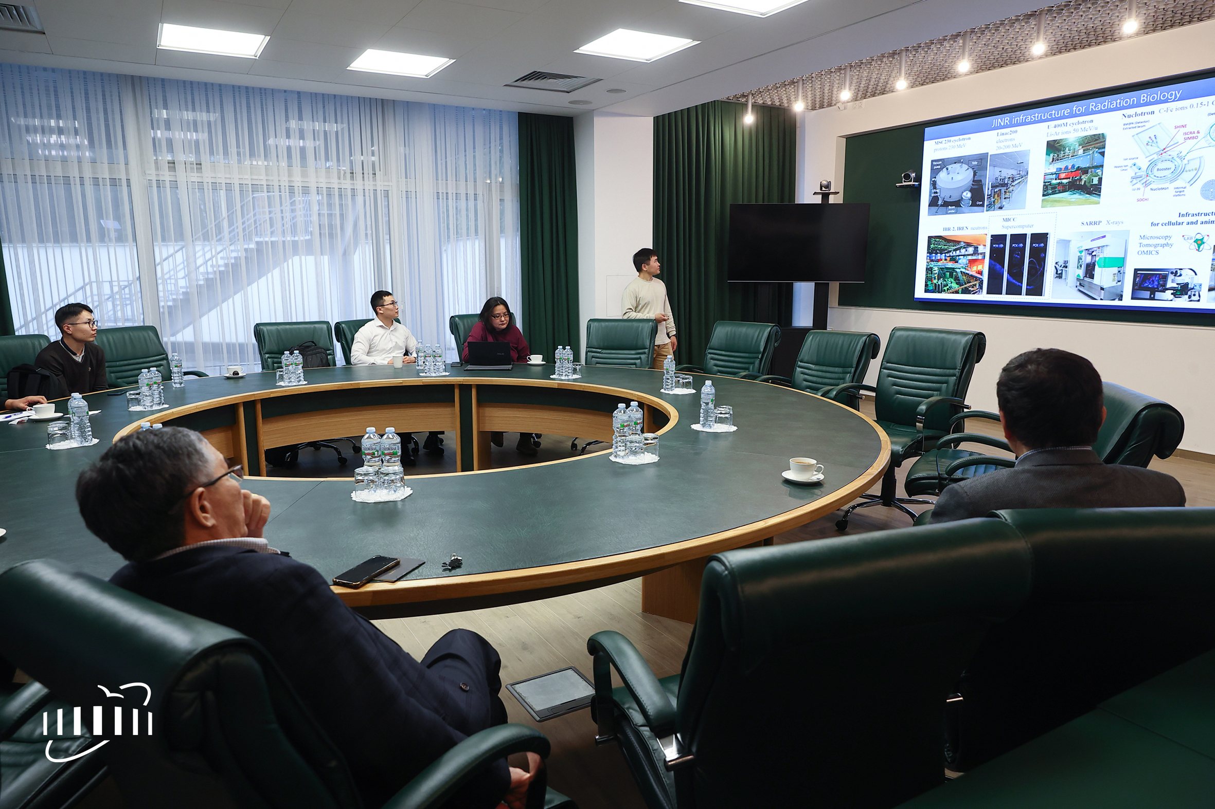 The delegation of Mongolia visited the Laboratories of Radiation Biology, Neutron Physics, and Information Technologies at JINR, where they toured the main facilities and held talks with the laboratories’ leadership. At the end of the visit, members of the National Group of Mongolia at JINR presented their research to Suren Davaa and talked about the living conditions in Dubna.