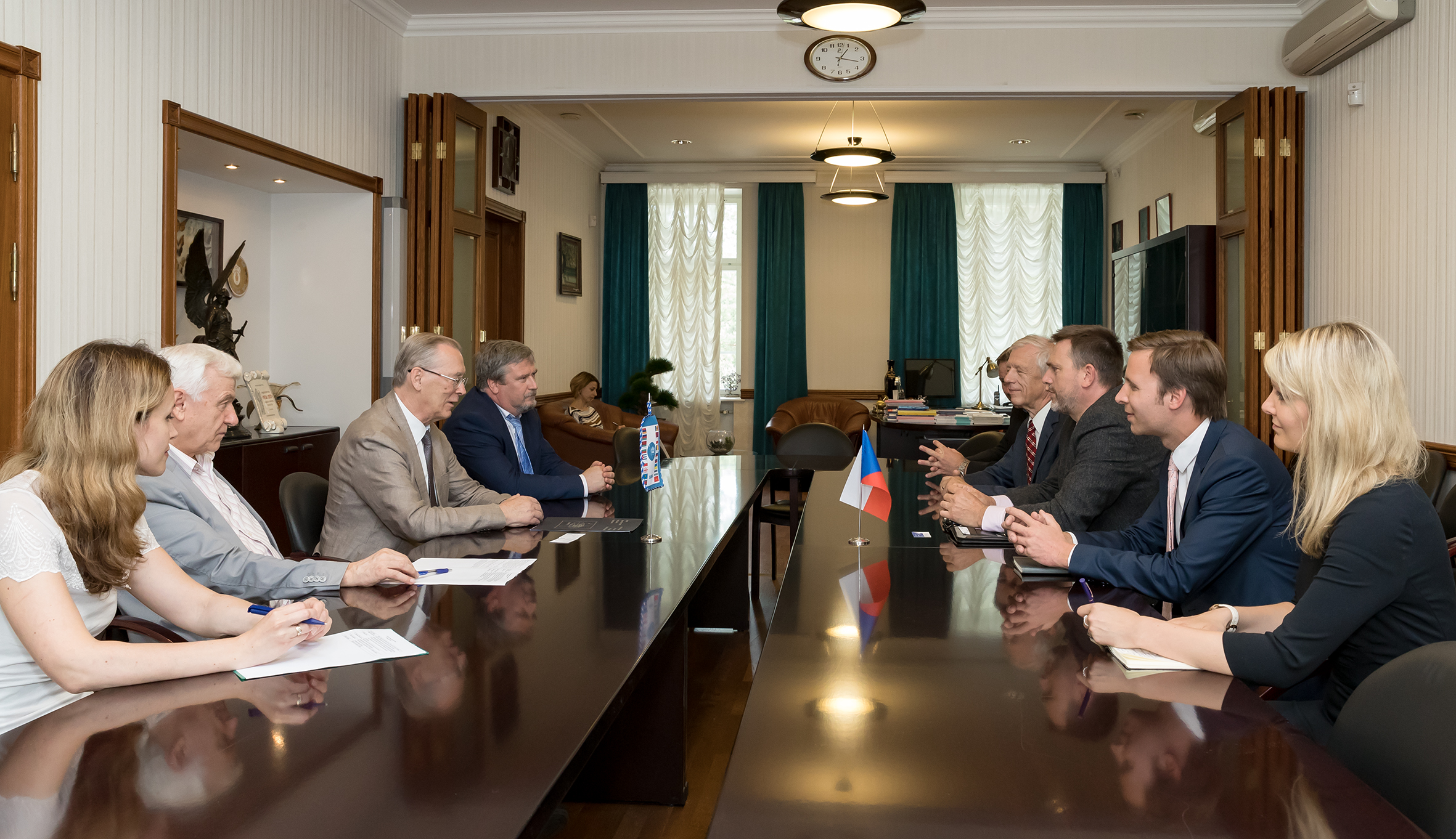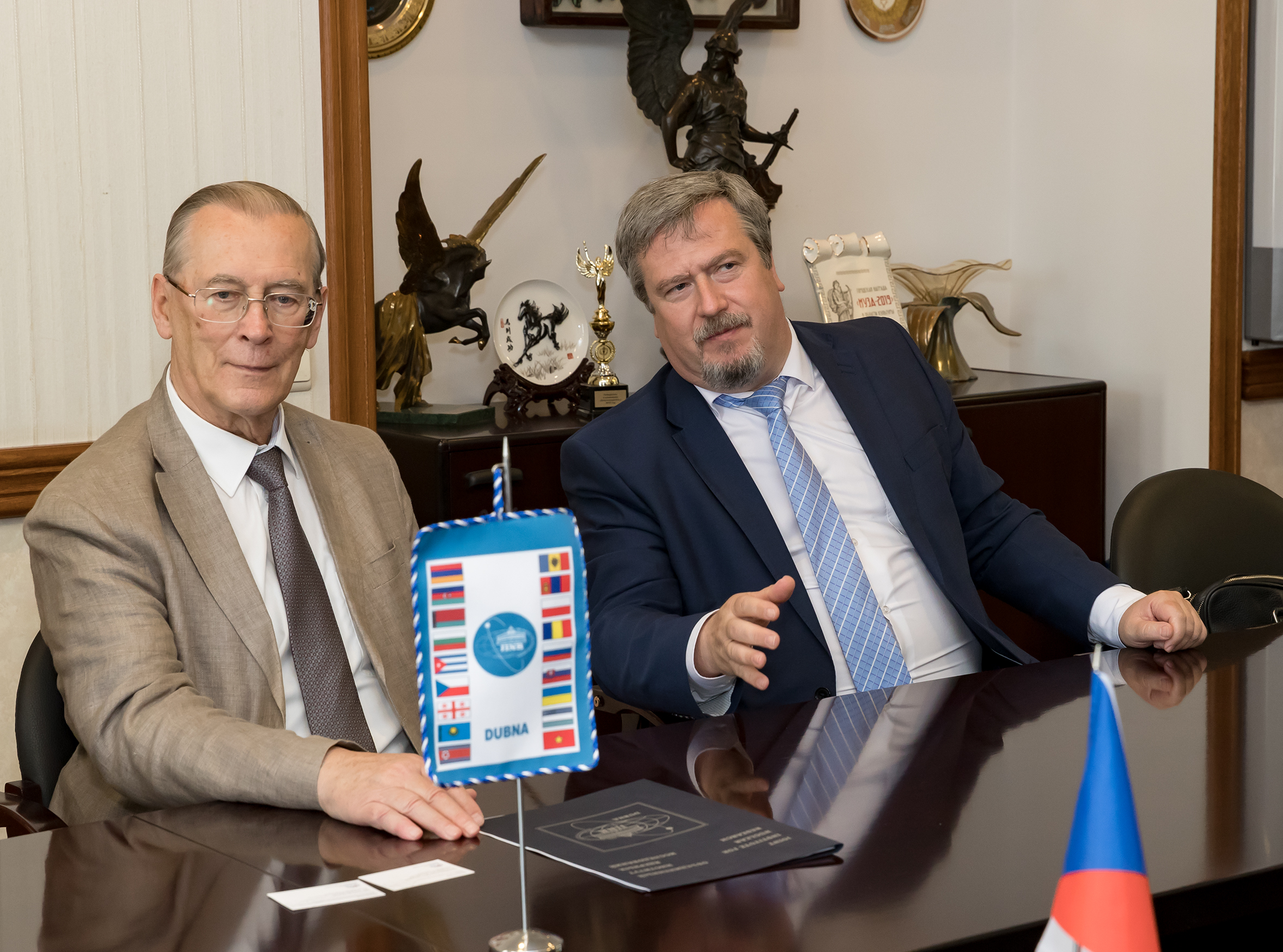 В Дирекции ОИЯИ делегацию принял директор ОИЯИ академик Виктор Матвеев. Со стороны ОИЯИ во встрече также принимали участие вице-директор ОИЯИ Рихард Ледницки, заместитель начальника Отдела международных связей ОИЯИ Анна Котова и начальник группы Службы материально-технического снабжения Павел Догнал. По словам Мартина Поспишла основной целью визита делегации было знакомство с Объединенным институтом и поиск возможностей для развития сотрудничества с ОИЯИ. Чешские представители подчеркнули большой интерес к представленной Рихардом Ледницки обзорной презентации об ОИЯИ, выделив в качестве перспективных областей взаимодействия области инновационных технологий, искусственного интеллекта и протонной терапии. Комментируя информацию о международном сотрудничестве ОИЯИ в области синтеза новых сверхтяжелых элементов, Мартин Поспишил подчеркнул, что ОИЯИ являет прекрасный пример того, что в науке не существует границ и ограничений. Директор ОИЯИ Виктор Матвеев, наряду с развитыми научными связями Чехии и ОИЯИ, отметил опыт плодотворного сотрудничества Института с чешскими предприятиями, в том числе работу фирмы «Асарко» по реконструкции инфраструктурных зданий ОИЯИ и производство фирмой «Вакуум-Прага» высокотехнологичного оборудования для базовых установок ОИЯИ. Стороны выразили обоюдный интерес к дальнейшему развитию взаимодействия. В частности, чешские представители выдвинули предложение организовать проведение в следующем году в ОИЯИ Дней Вышеградской группы — объединения четырех центрально-европейских государств: Польши, Чехии, Словакии и Венгрии.