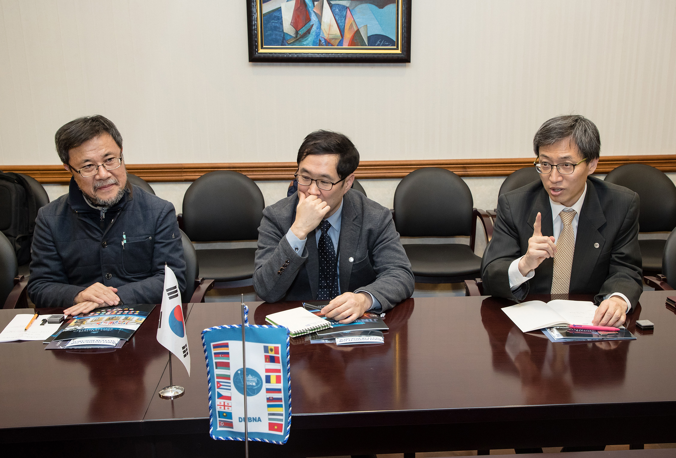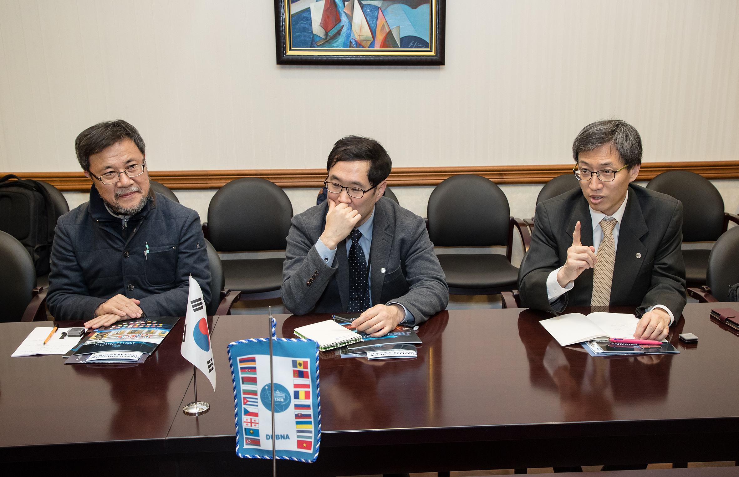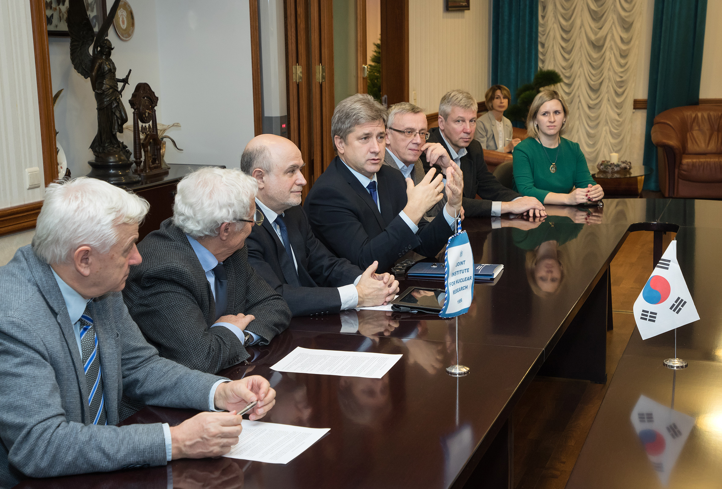 На итоговой встрече в дирекции ОИЯИ представителей Республики Корея приветствовали вице-директора ОИЯИ М.Г. Иткис и Р. Ледницки, ключевые руководители ОИЯИ по организации научной кооперации. Корейская сторона отметила, что для РК сферой особого интереса является экспертиза ОИЯИ в области проведения физических экспериментов и организации международной пользовательской программы. Гости выразили заинтересованность в установлении сотрудничества с Объединенным институтом также и в сфере подготовки молодых корейских ученых на базе ОИЯИ.