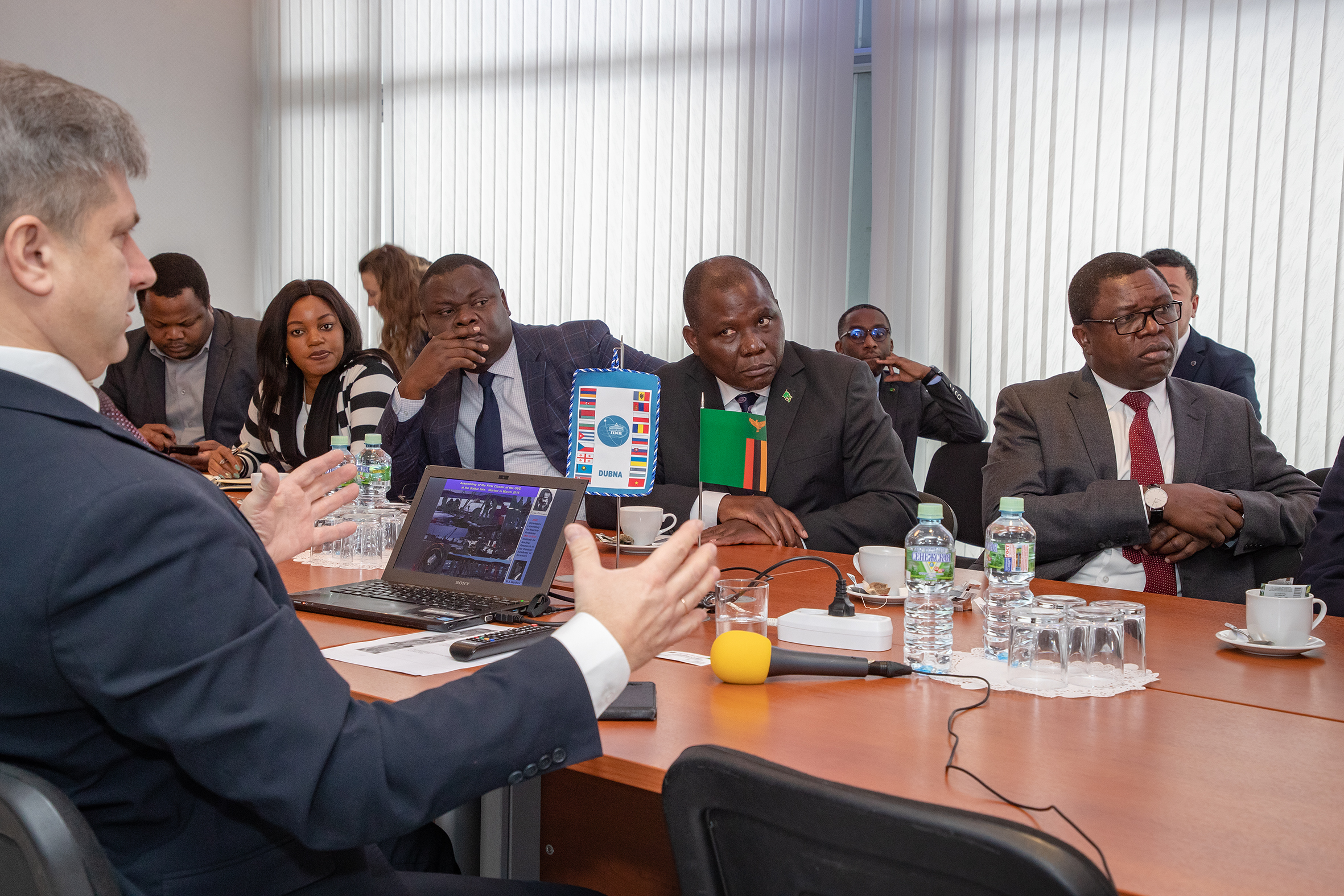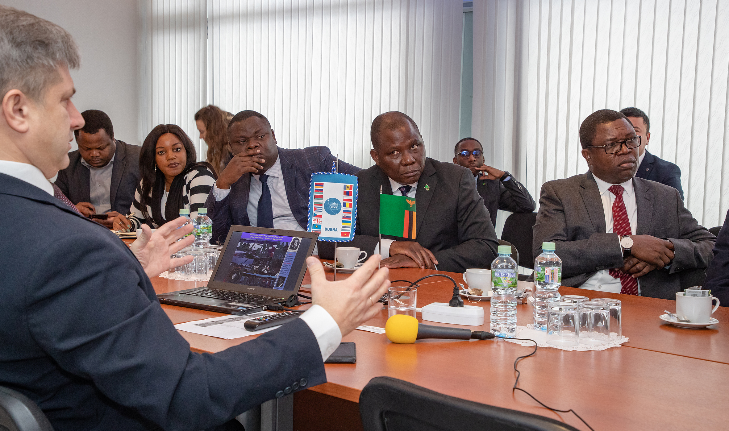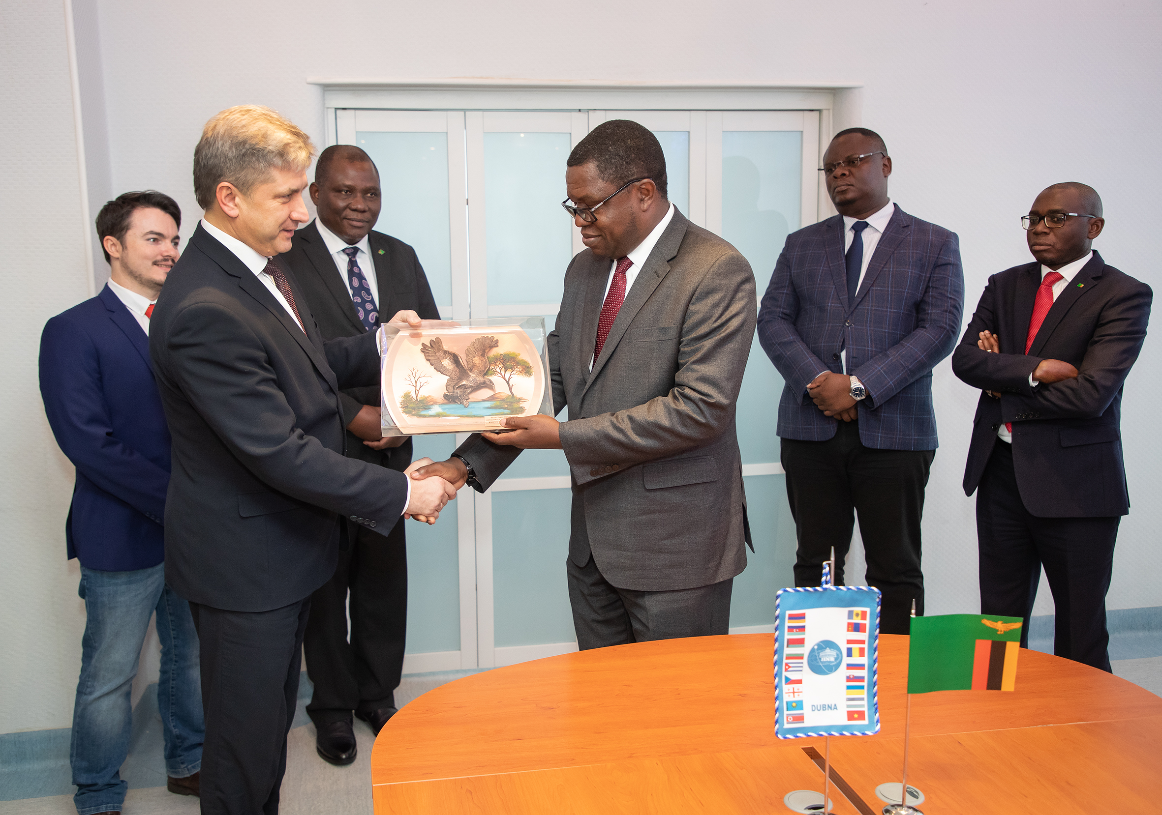 Знакомство с научной инфраструктурой ОИЯИ делегация начала с обзорной лекции, гости посетили Лабораторию нейтронной физики и Лабораторию ядерных реакций. Особый интерес гостей вызвала установка РЕГАТА и аналитические исследования методом нейтронного активационного анализа. Делегацию ОИЯИ на состоявшейся рабочей встрече с руководством ОИЯИ возглавил начальник Отдела международного сотрудничества Дмитрий Каманин. Стороны обсудили организацию сотрудничества по вопросам, связанным со строительством Замбией своего первого исследовательского реактора, прежде всего, возможности по подготовке кадров на базе ОИЯИ. В ходе дискуссии была подчеркнута важность информирования правительства Замбии об исследовательской деятельности и образовательных программах ОИЯИ. Участвовавшие в беседе сотрудники ОИЯИ из Египта и ЮАР поделились опытом организации сотрудничества с ОИЯИ в своих странах.