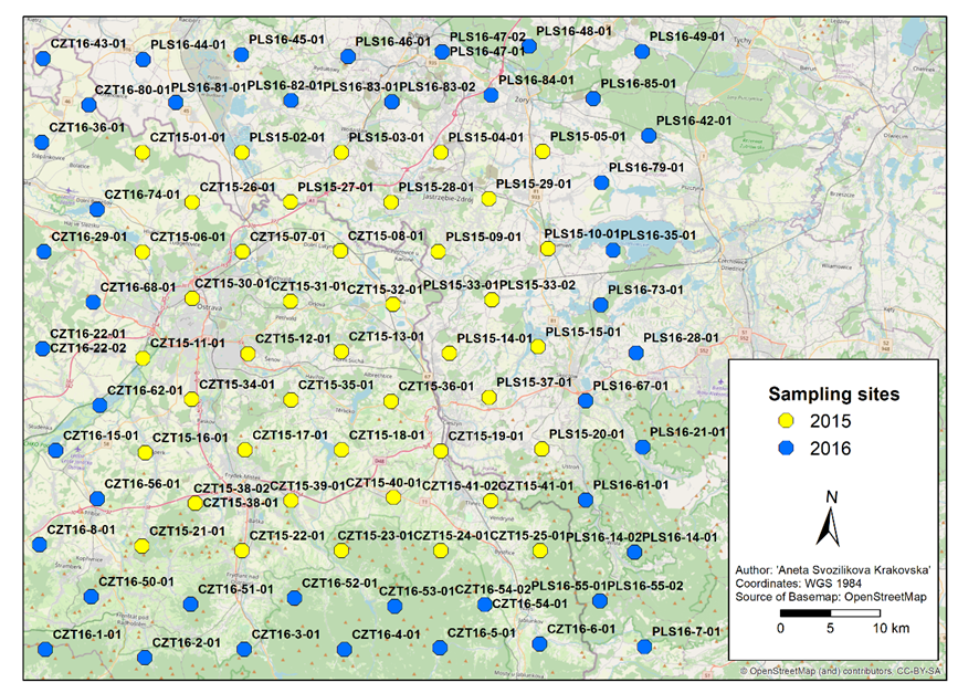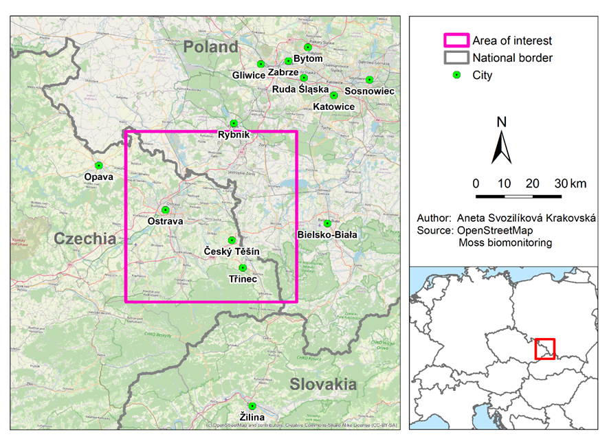 Согласно карте Европейского агентства по окружающей среде (ЕАОС), представляющей среднегодовые концентрации PM10 в 2016 году, территориями с самыми высокими аэрозольными пылевыми нагрузками являются Польша, Чешская Республика, Моравско-Силезский край, особенно в районах Остравы и Карвины. В 2015 году с использованием ГИС-технологий был выбран участок отбора проб и создана сеть точек отбора проб на чешско-польских приграничных территориях с самыми высокими в Европе аэрозольными запыленностями. Также в одном месте были собрано разные виды мхов для возможности сравнения их сорбционной способности. Сеть также была расширена до мест, где загрязнение не ожидалось. Всего было отобрано 44 пробы с 41 точки отбора проб регулярной сетью на площади 1600 км2 (40 х 40 км). В 2016 г. сеть была расширена еще на 44 точки отбора проб, где всего было отобрано 50 проб мхов (рис. 1). Отбор проб проводился в квадратной сети со стороной 60 км, площадью 3600 км2, где точки находятся на расстоянии не более 10 км друг от друга. Всего опробовано 85 локаций, взято 94 пробы мхов.