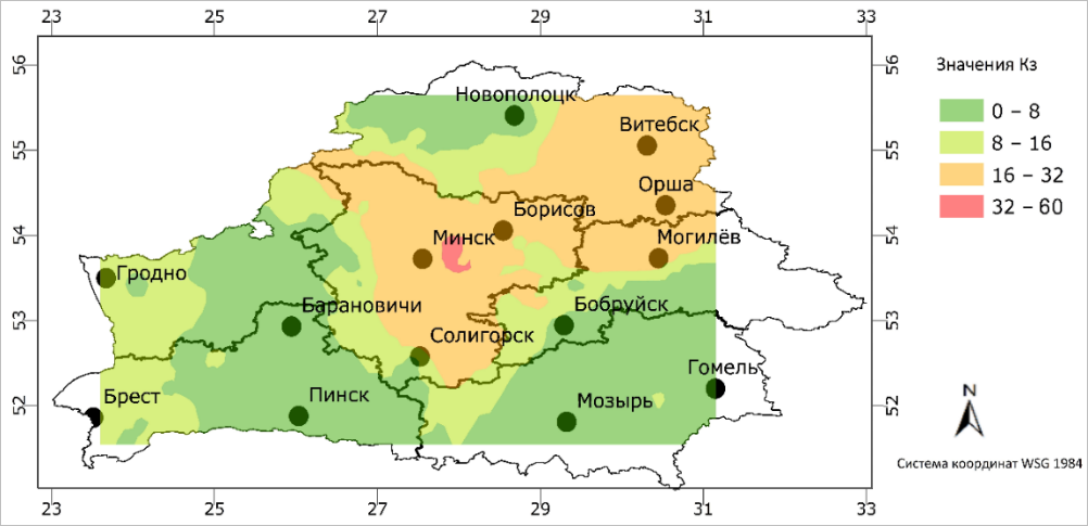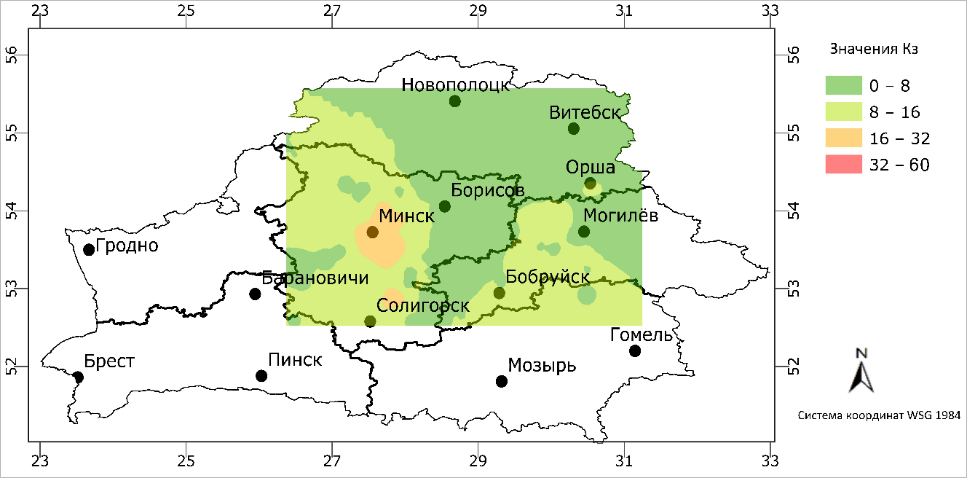 Рисунок 3. Географическое распределение показателя К3 в исследованиях 2015 г