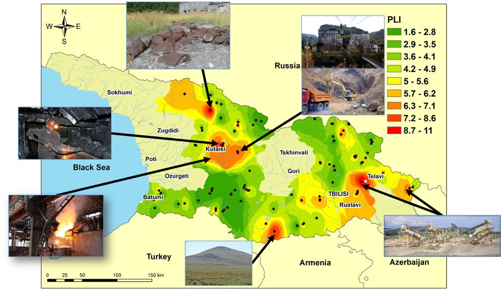 Было определено несколько очагов с повышенным содержанием атмосферных выпадений токсичных элементов, среди них надо отметить металлургические предприятия и горнодобывающие предприятия, такие как машиностроительный завод в Кутаиси, Зестафонский завод ферросплавов, заброшенные месторождения мышьяка в д. Урави, Чиатурский горнорудный комплекс и другие. Для визуализации пространственного распределения «горячих точек» использовался индекс нагрузки загрязнения PLI (Pollution Load Index) (рис. 2) [1-3].