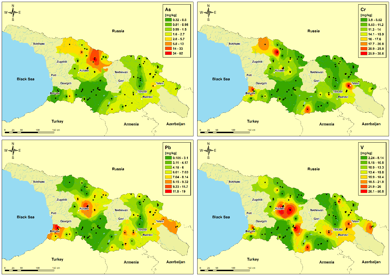 Рис. 1. Распределение мышьяка (As), хрома (Cr), свинца (Pb) и ванадия (V) в образцах мхов (Примечание: черные точки на карте — места отбора проб)