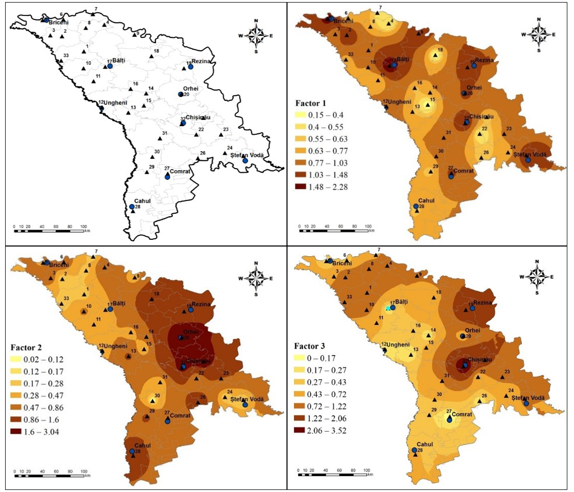 Рисунок 1. Карта Молдовы с указанием точек отбора проб (а), а также распределения факторов 1 (б), 2 (в) и 3 (г), соответственно