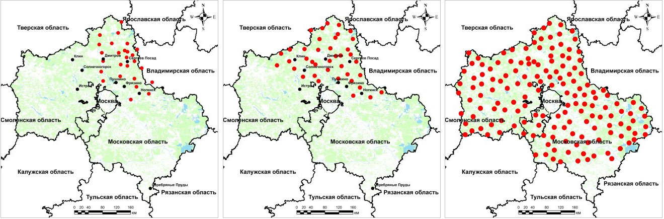 В Московской области проведено уже 3 широкомасштабных исследования. Первое исследование в 2004 году охватывало небольшую часть северо-востока региона и включало 26 точек пробоотбора. Второй пробоотбор в 2014 году охватывал уже большую часть севера и северо-востока области и включал 39 точек пробоотбора, а третий севей в 2019 году охватывал уже всю территорию Московской области и включал 156 точек пробоотбора (рис.1).