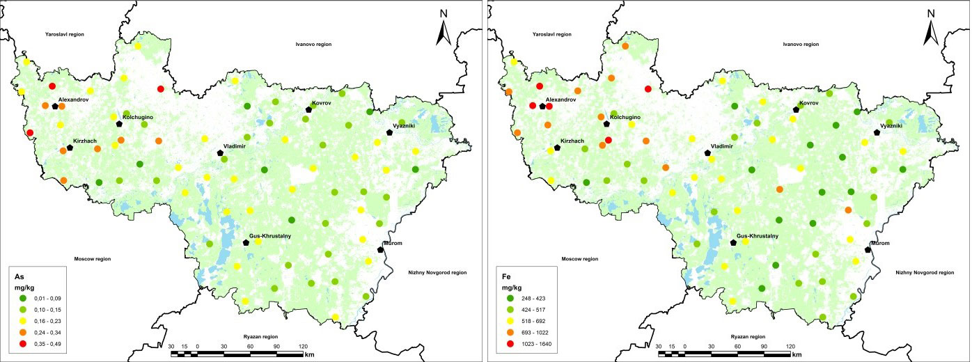 Рисунок 4. Карта распределения As и Fe на территории Владимирской области