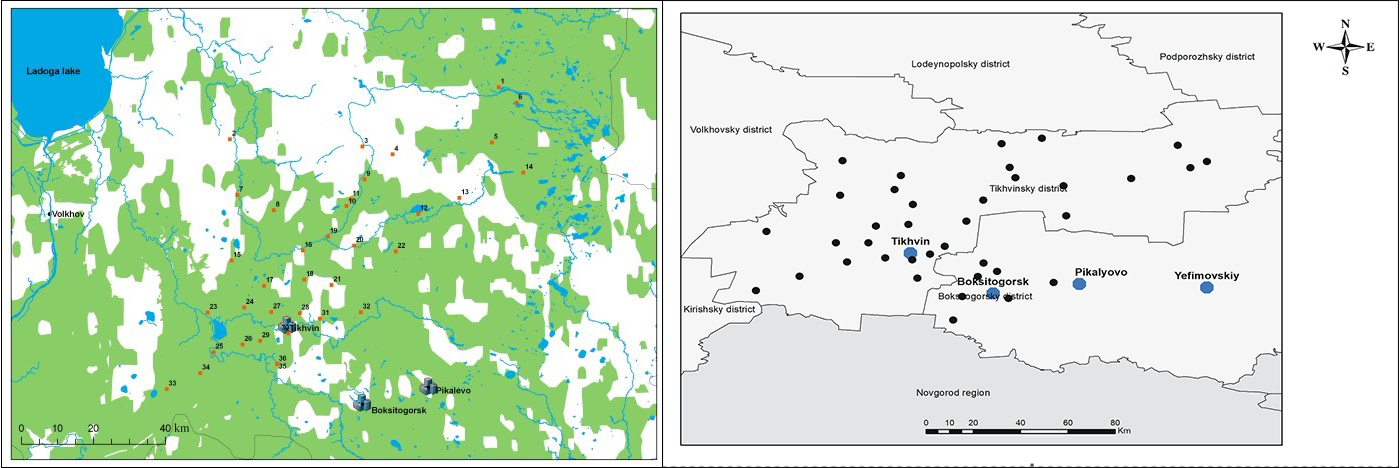 Исследования в Ленинградской области проводились в районе города Тихвин. В 2010 году было отобрано 36 проб мха, а в 2017 году собраны образцы с 37 точек пробоотбора (рис.6).
