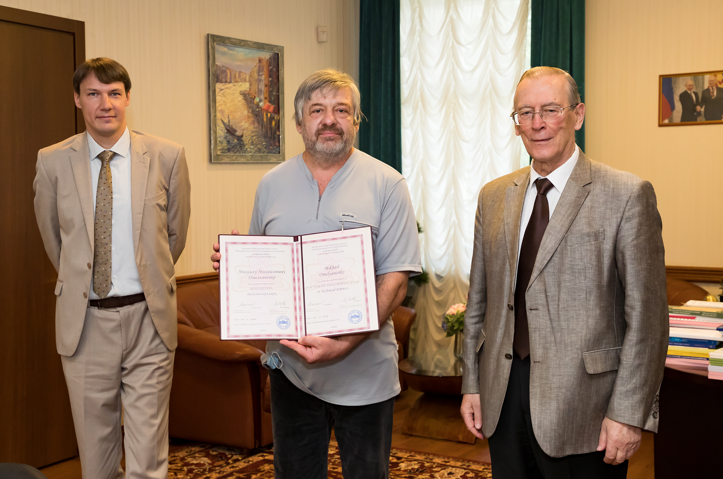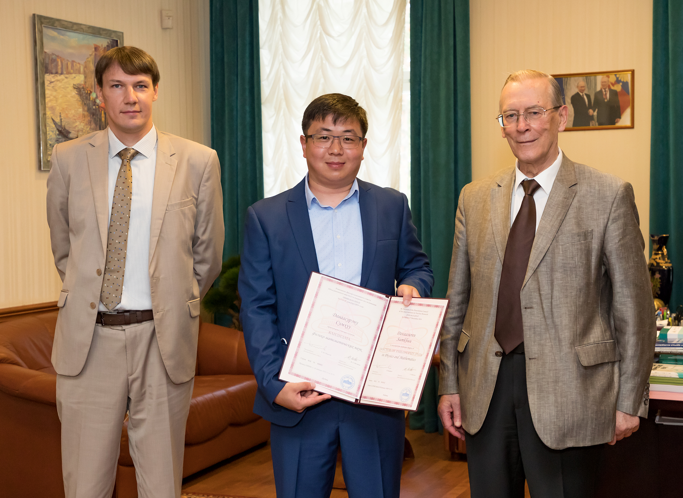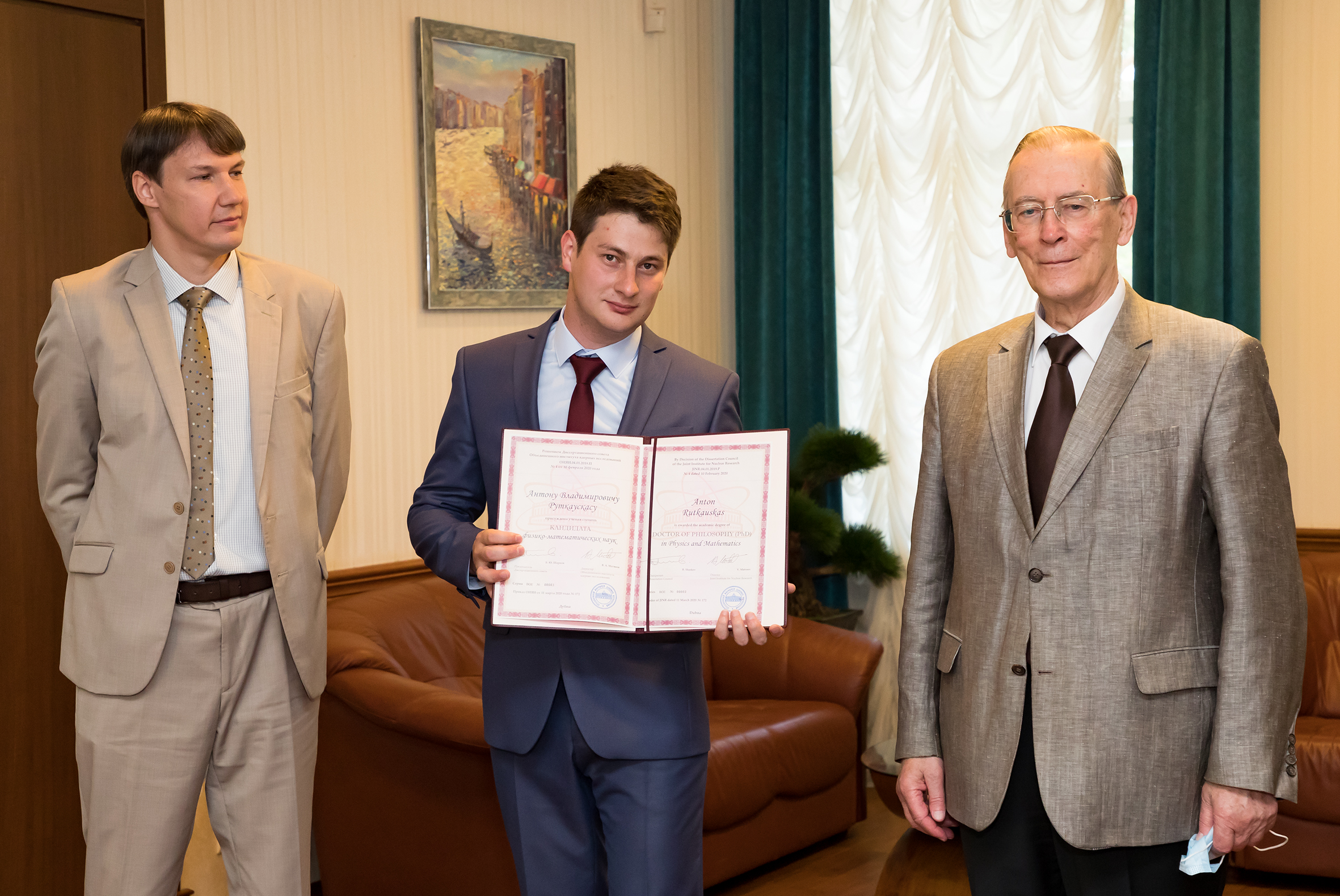 20 июля 2020 года директор Института Виктор Анатольевич Матвеев вручил дипломы ОИЯИ о присуждении ученой степени трем защитившимся соискателям: Даваасурэну Сумхуу — сотруднику ЛНФ, гражданину Монголии, Антону Владимировичу Руткаускасу — сотруднику ЛНФ, гражданину Российской Федерации, и Михаилу Михайловичу Омельяненко — сотруднику ЛФВЭ, гражданину Российской Федерации. Вручение состоялось в торжественной обстановке в кабинете директора, став вторым подобным мероприятием в стенах Института с начала реализации права самостоятельного присуждения ученых степеней. В церемонии вручения дипломов также приняли участие: первый вице-директор ОИЯИ Г. В. Трубников, вице-директор ОИЯИ В. Д. Кекелидзе, главный ученый секретарь ОИЯИ А. С. Сорин, ученый секретарь Квалификационной комиссии ОИЯИ О. В. Белов, ученый секретарь диссертационного совета ОИЯИ по физике частиц В. А. Арефьев. Защитившиеся ученые получили дипломы ОИЯИ с номерами 00002, 00003 и 00004 соответственно.
