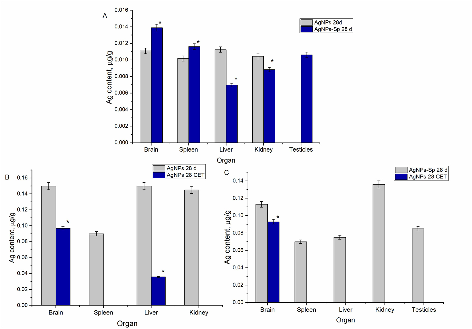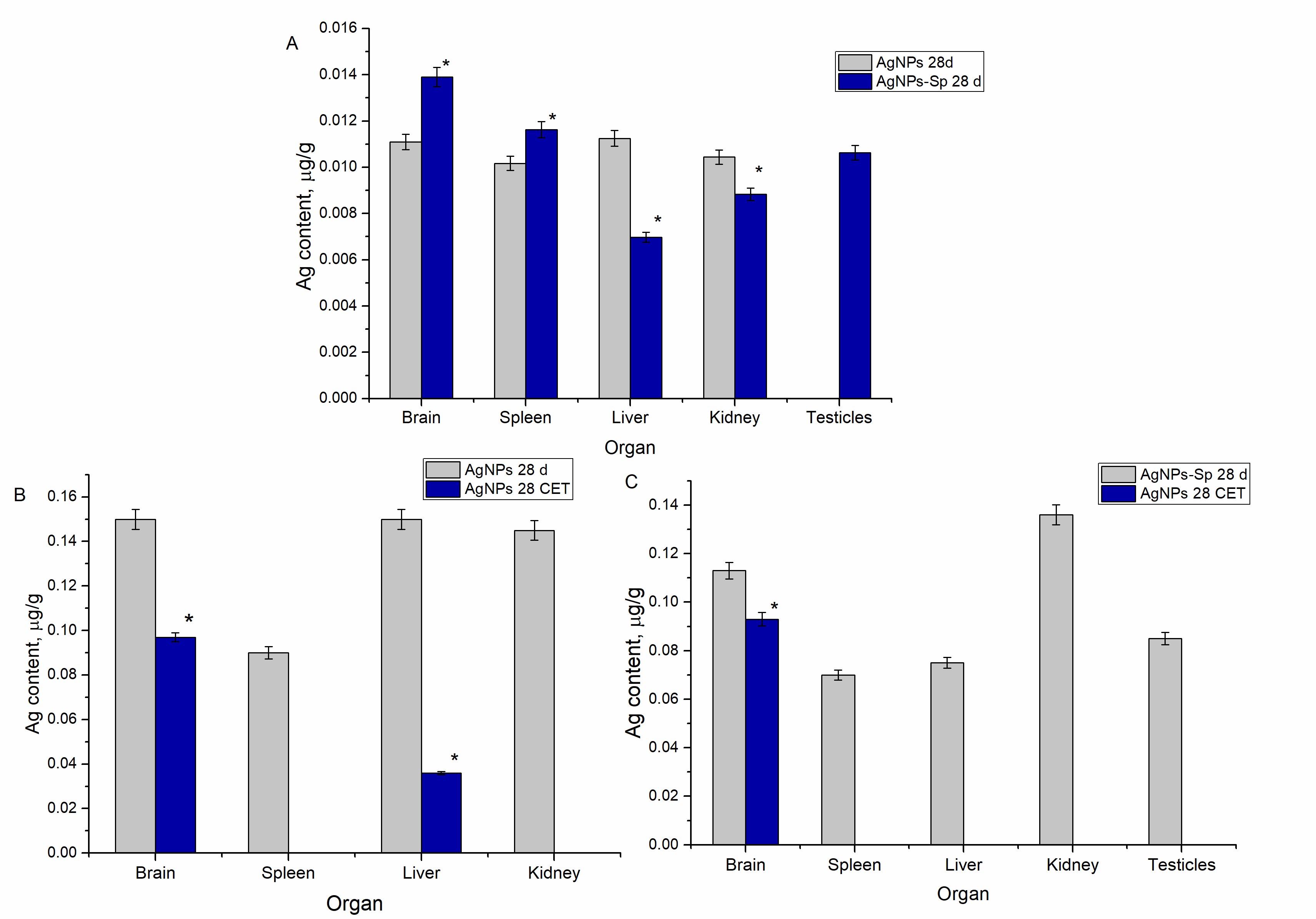 Рис. 2 Содержание серебра в органах крыс: (A) животные, которым вводили AgNPs и AgNPs-Spirulina в течение 28 дней, измеренное сразу после окончания эксперимента; (B) животные, которым вводили AgNP в течение 28 дней измеренное после периода полувыведения; (C) животные, которым вводили AgNPs-Spirulina в течение 28 дней измеренное после периода полувыведения