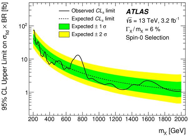 На этом графике, за которым закрепилось жаргонное название «график в виде бразильского флага», показаны цветные области в 1 и 2 сигма, по которым должна была бы проходить экспериментальная кривая. Должна была бы — если бы в данных была чистая СМ, без Новой физики. Видно, что при 750 ГэВ реальная кривая, полученная ATLAS, сильно выскакивает из этой зоны. Это значит, что в данных имеется некоторое превышение, которое препятствует установлению ограничения сверху для Mx = 750 ГэВ. Является ли это новой частицей или чем-то еще, экспериментаторы на данном этапе не говорят; они лишь честно заявляют, что попытки установить ограничение сверху наталкиваются на «сопротивление данных».