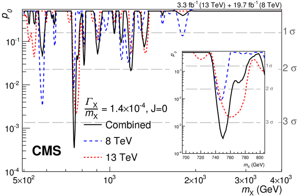 На рис. 2 показан график зависимости локального p-значения от инвариантной массы двух фотонов. Это число означает вероятность того, что чистая СМ за счет случайной флуктуации способна породить такое же или более сильное отличие в данных от ожиданий СМ. Видно, что в окрестности 750 ГэВ эта вероятность опускается ниже одной тысячной, что отвечает локальному отклонению 3,4σ. С учетом эффекта множественной выборки глобальная статистическая значимость отклонения составляет пока скромные 1,6σ.