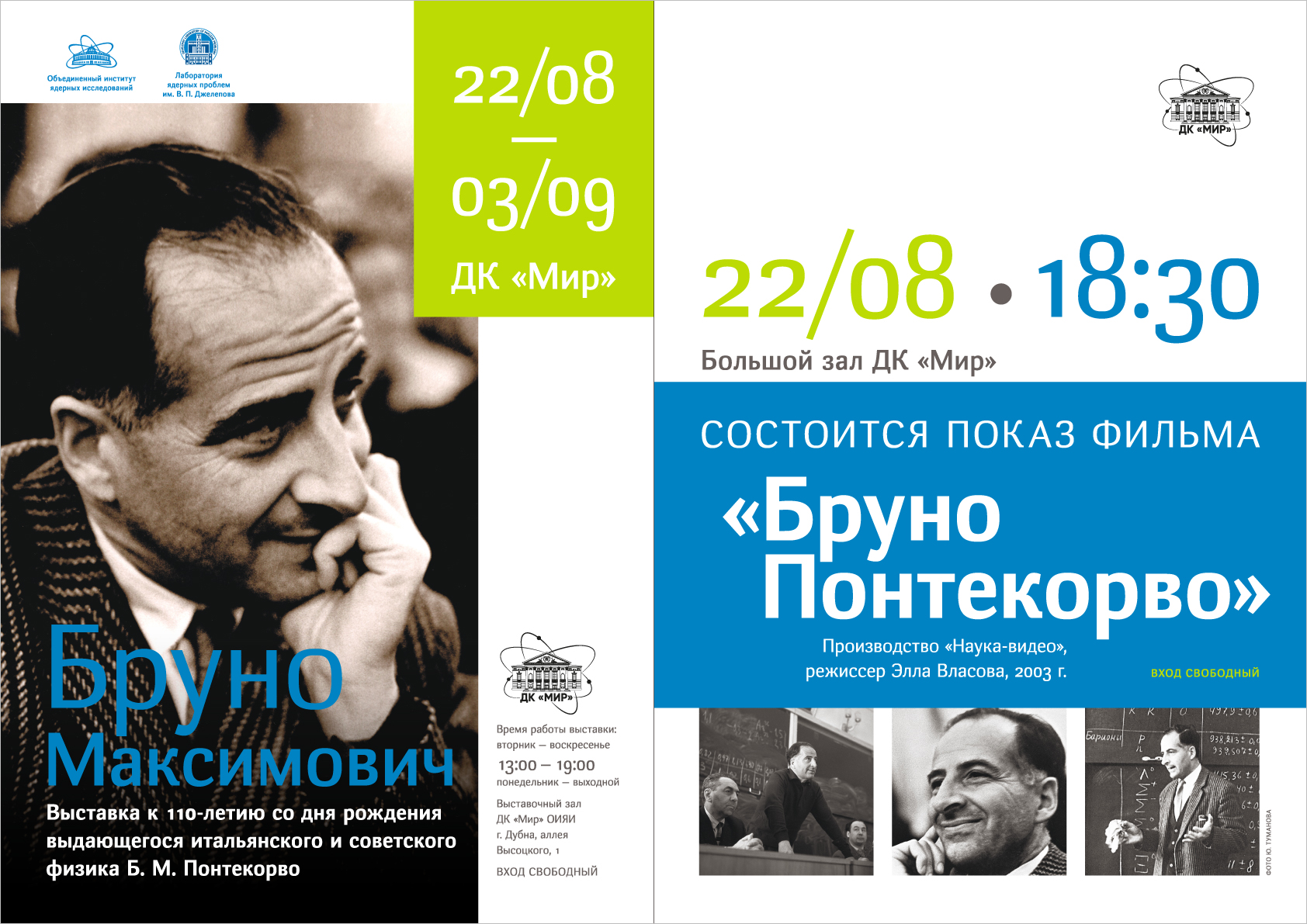 С 22 августа по 3 сентября 2023 г. в выставочном зале Дома культуры «Мир» ОИЯИ будет проходить выставка «Бруно Максимович» к 110-летию со дня рождения выдающегося итальянского и советского физика Бруно Понтекорво.