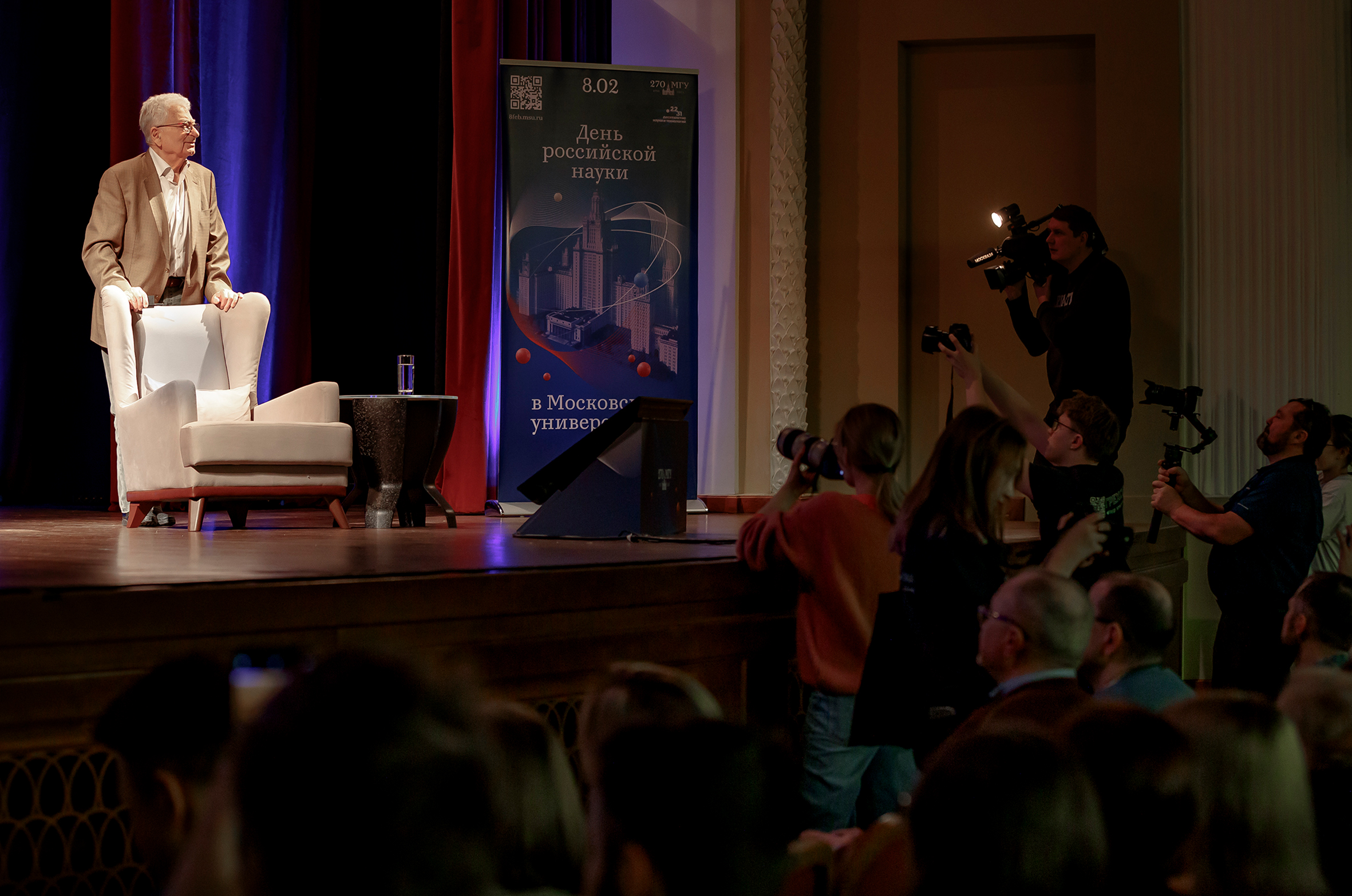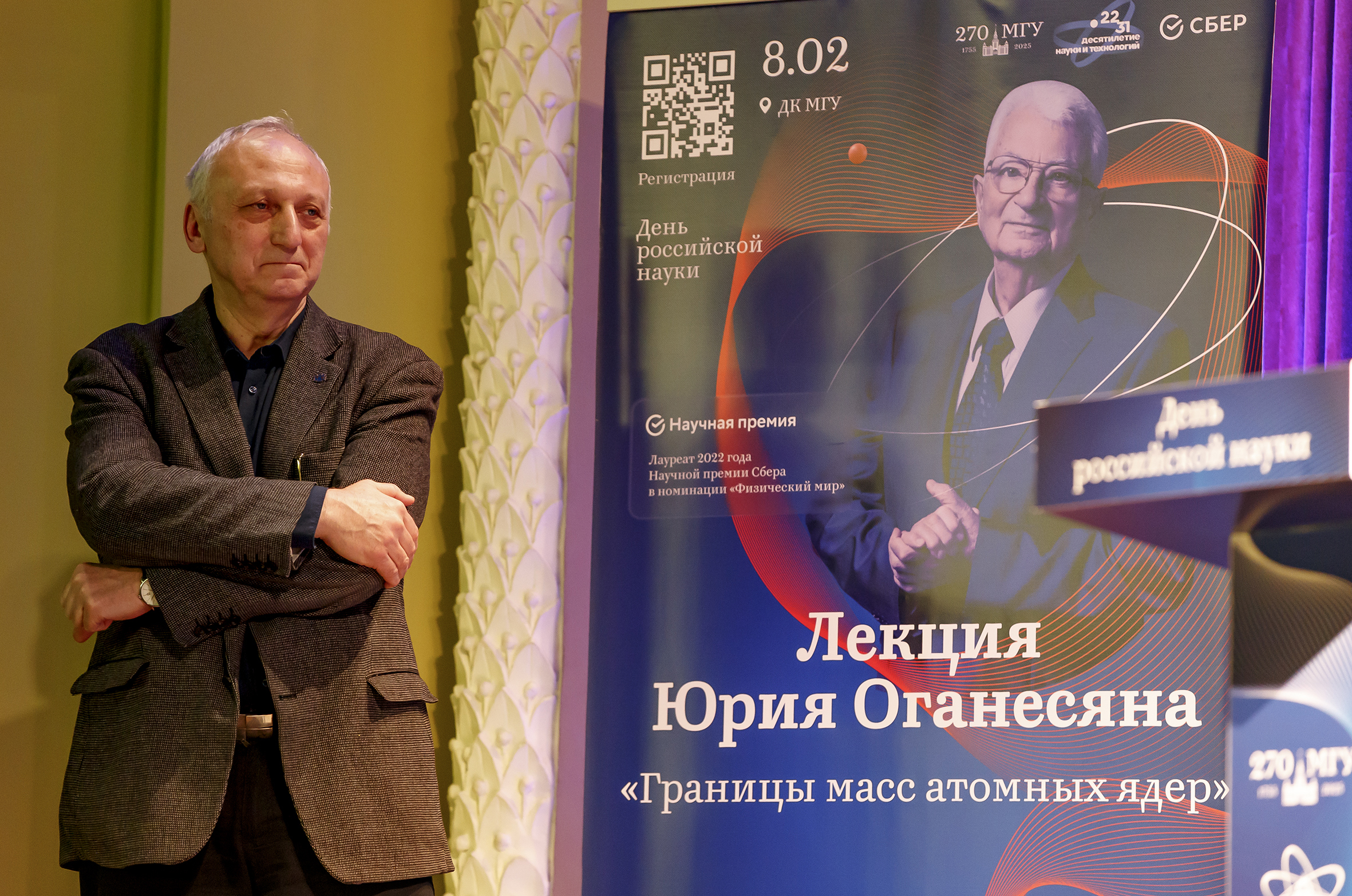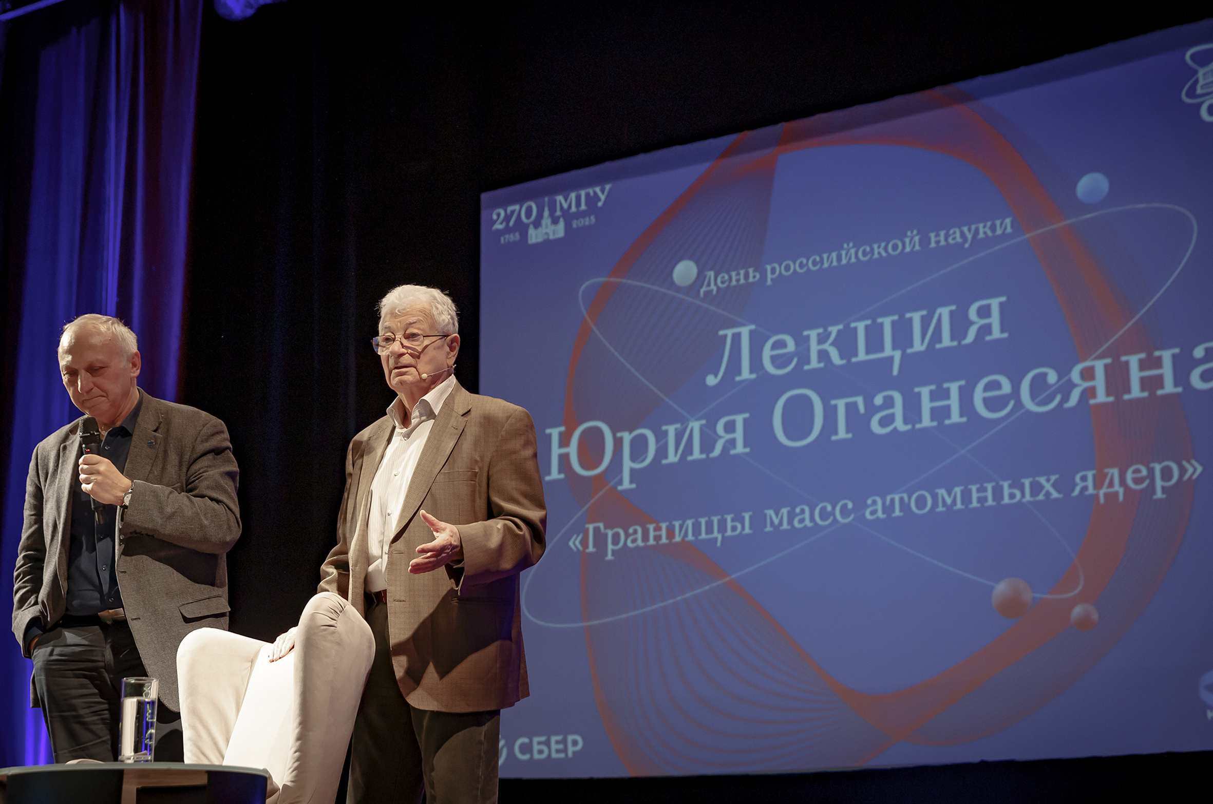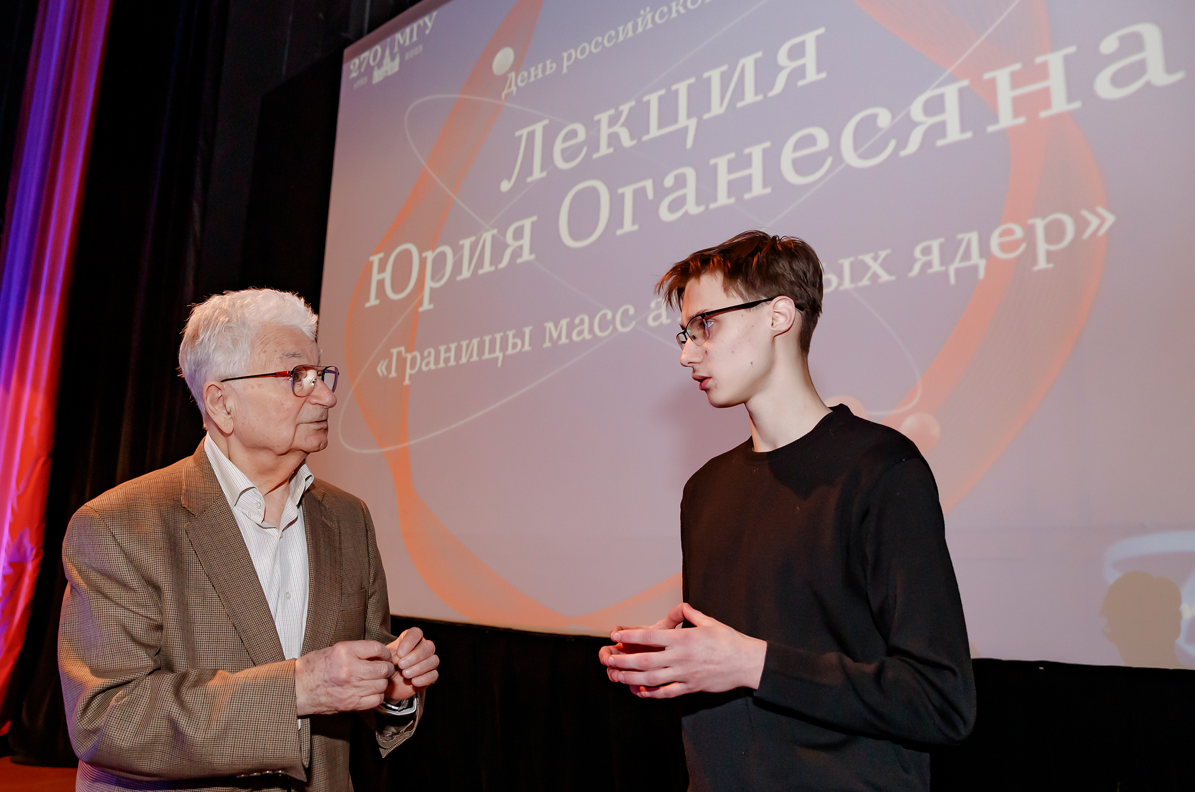 On 8 February, the Day of Russian Science, FLNR JINR Scientific Leader RAS Academician Yuri Oganessian delivered a lecture “The mass boundaries of atomic nuclei” by invitation of Rector of Moscow State University Victor Sadovnichy. Listeners stood in the aisles since the hall of the MSU Cultural Centre, where the outstanding scientist spoke, could barely accommodate everyone. Questions and answers that followed the lecture took almost an hour.