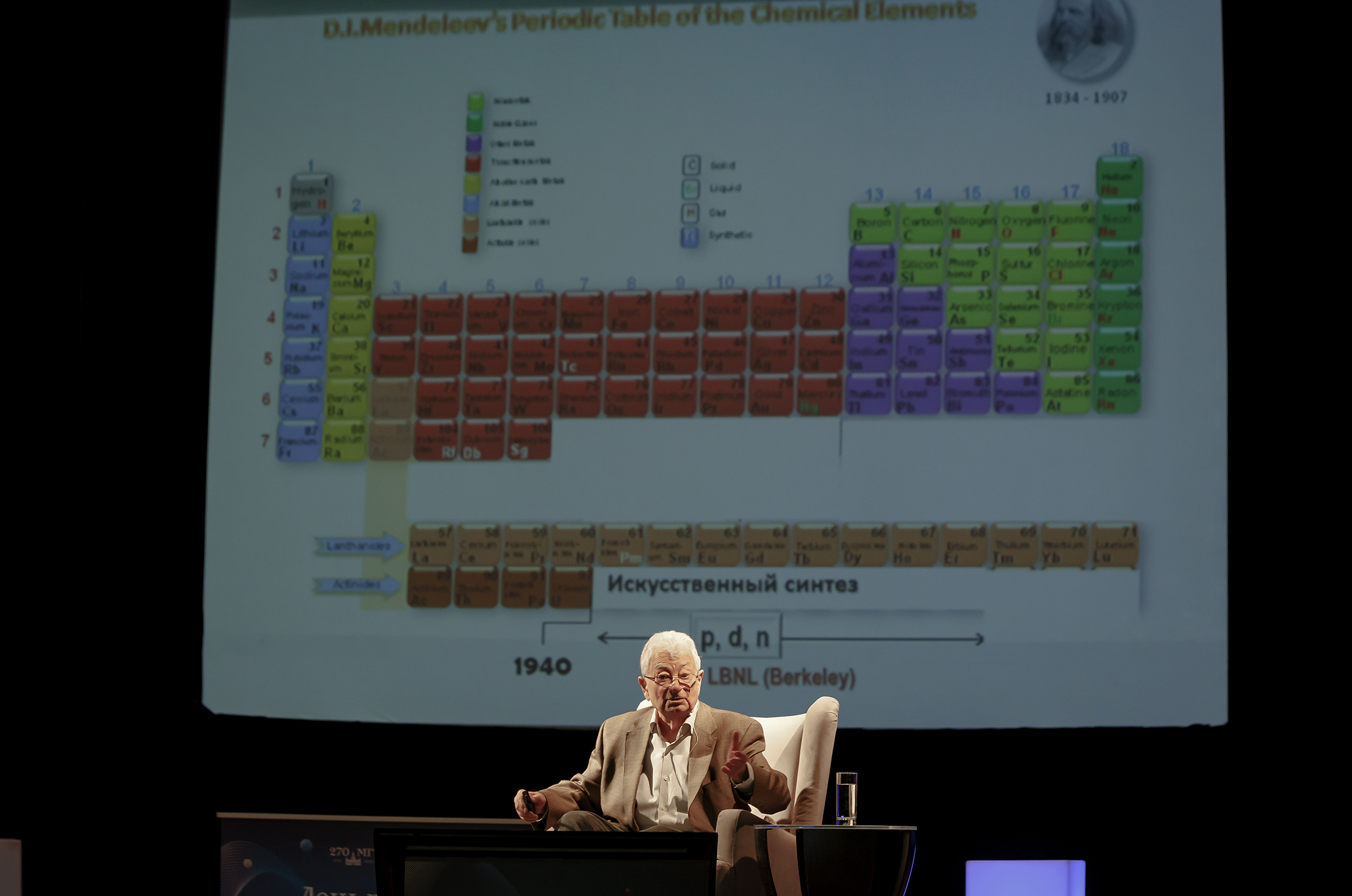Yuri Oganessian began his speech with congratulations on the Day of Russian Science and recalled that he was giving a lecture on Dmitri Mendeleev’s birthday 154 years after he discovered the periodic law. “Now, a century and a half later, this law remains relevant and stands at the forefront of tasks of modern science,” Yuri Tsolakovich said.