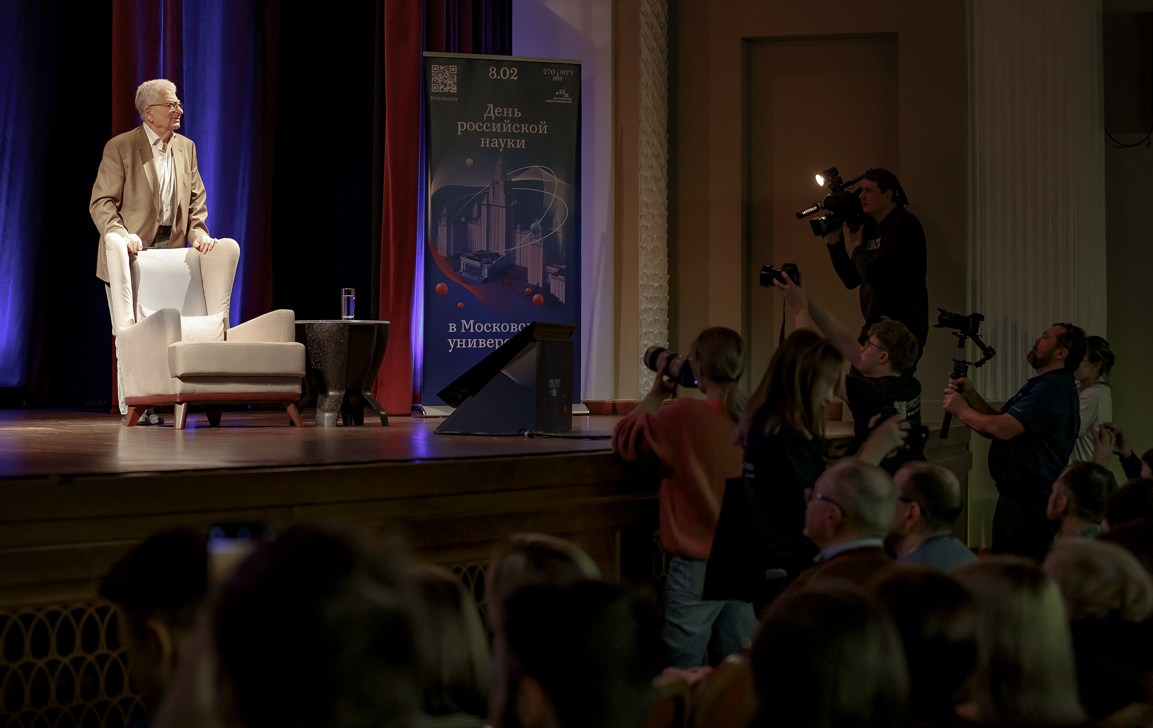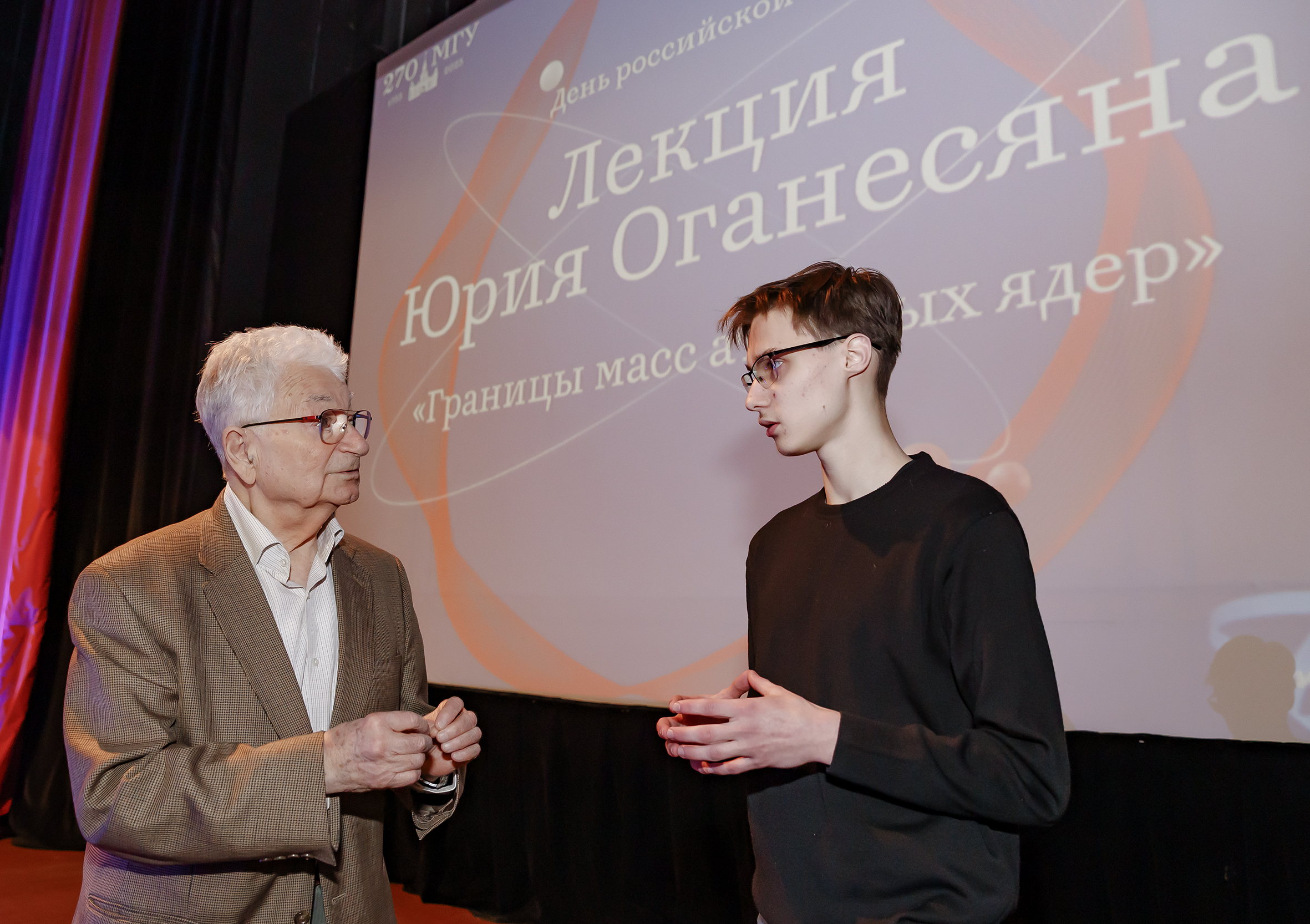 On 8 February, the Day of Russian Science, FLNR JINR Scientific Leader RAS Academician Yuri Oganessian delivered a lecture “The mass boundaries of atomic nuclei” by invitation of Rector of Moscow State University Victor Sadovnichy. Listeners stood in the aisles since the hall of the MSU Cultural Centre, where the outstanding scientist spoke, could barely accommodate everyone. Questions and answers that followed the lecture took almost an hour.