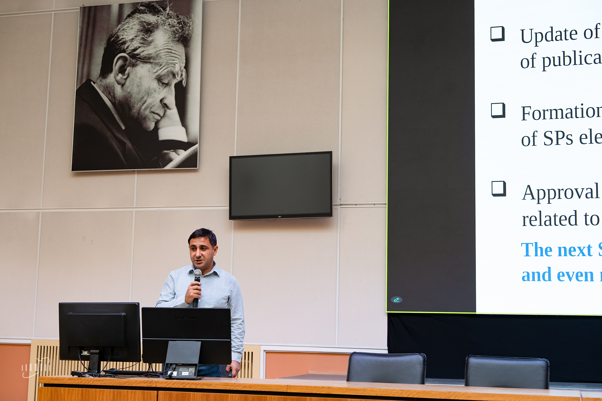 Научную программу открыл доклад председателя Совета коллаборации SPD, ведущего научного сотрудника Национальной научной лаборатории им. А. Алиханяна (Армения) Армена Тумасяна. В своем выступлении он проинформировал участников о последних изменениях состава Исполнительного совета коллаборации (Executive Board) и новых ответственных координаторах. Так, в 2026 году пост координатора физической программы SPD займет старший научный сотрудник Лаборатории ядерных проблем ОИЯИ Амареш Датта, а его заместителями станут Игорь Денисенко (ЛЯП ОИЯИ) и Евгений Солдатов (НИЯУ МИФИ).