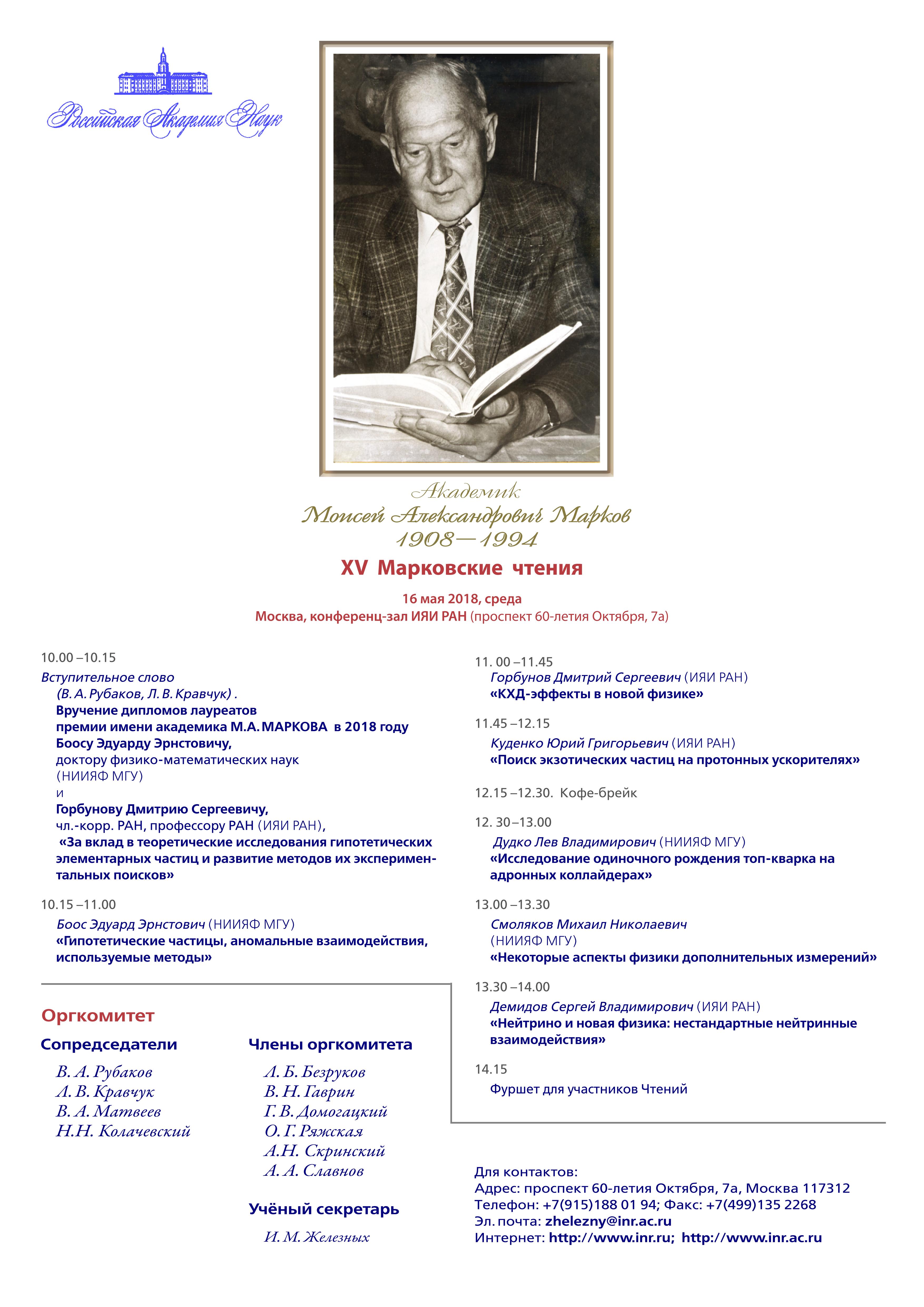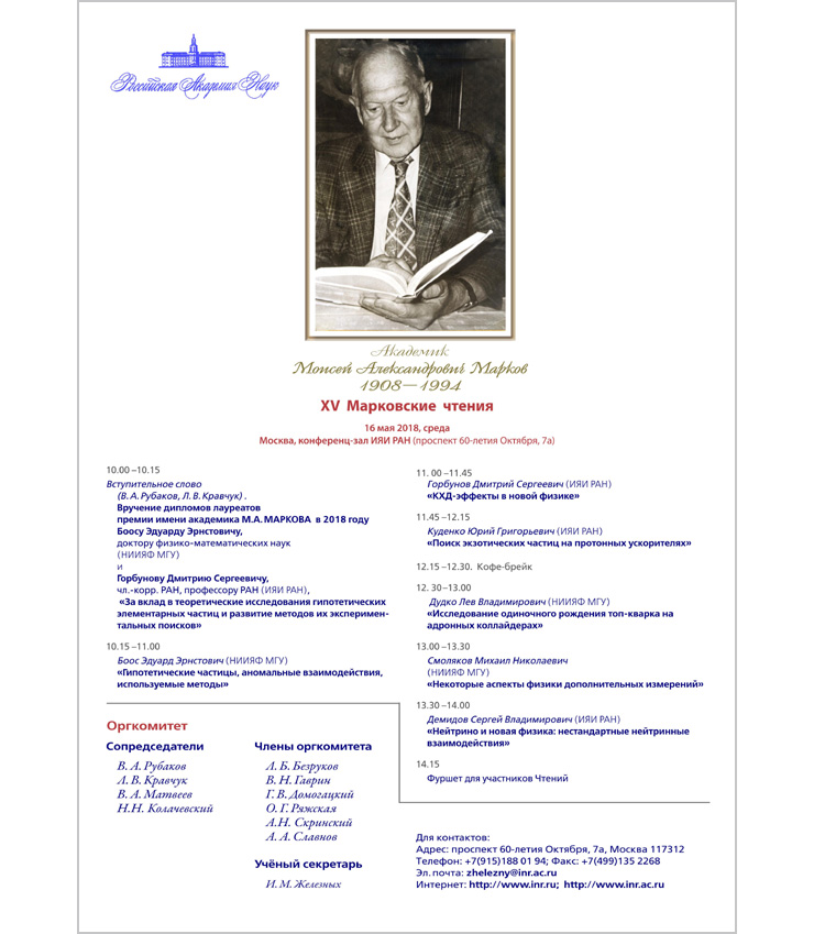 Академик Моисей Александрович Марков (1908 − 1994) — известный российский ученый, выдающийся физик-теоретик и организатор науки, внесший основополагающий вклад в исследования в области физики нейтрино, фундаментальных проблем физики элементарных частиц, квантовой гравитации и смежных проблем физики частиц и космологии. C 1967 по 1988 г. М. А. Марков занимал пост академика-секретаря отделения ядерной физики Академии наук СССР.