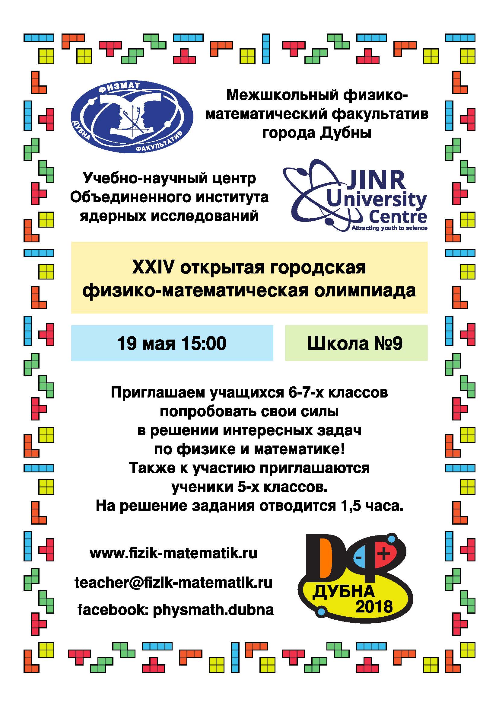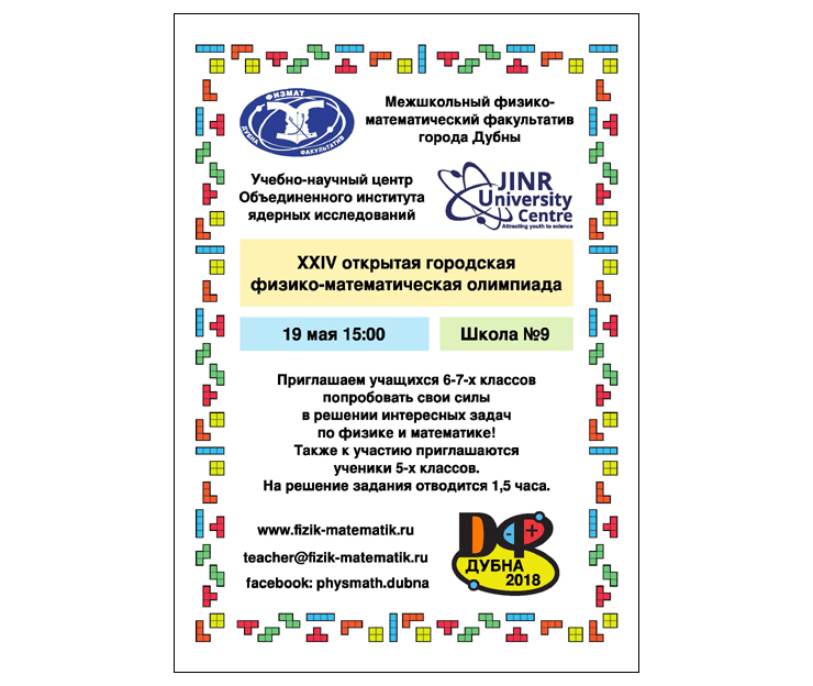 On Saturday, 19 May 2018, the Physics and Mathematics Open Classroom of the JINR University Centre will hold XXIV Open Physics and Mathematics Olympiad among schoolchildren of 6-7th grades. The competition will start at 3:00 PM. The time allotted for task is 1.5 hours. The competition will take place at School No.9, Sakharov Street, 17.