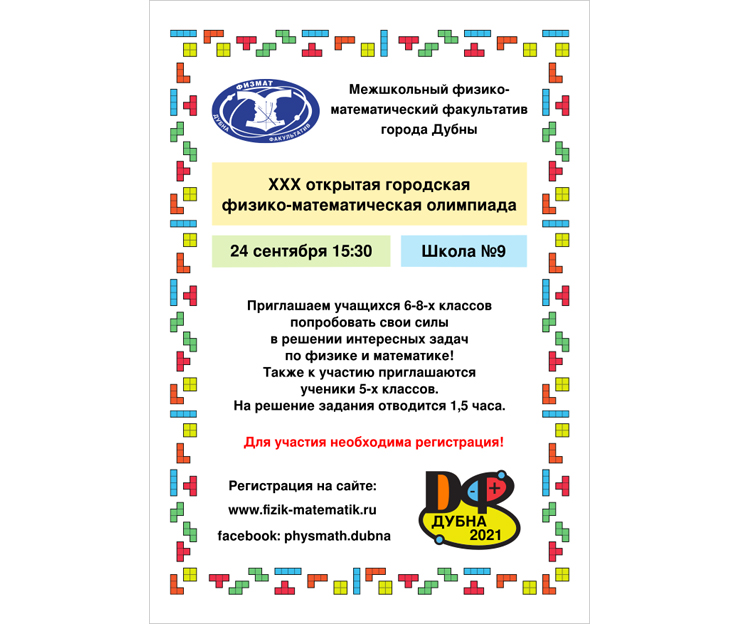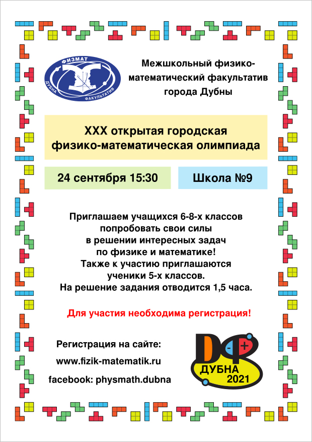 On Friday, 24 September, the Physics and Mathematics Open Classroom will hold the XXX Dubna Open Physics and Mathematics Olympiad for 6-8 grade school students. The start of the Olympiad is set at 3:30 PM. The time allotted for the task is 1.5 hours. The competition will take place at School No.9 (17, Sakharov street).