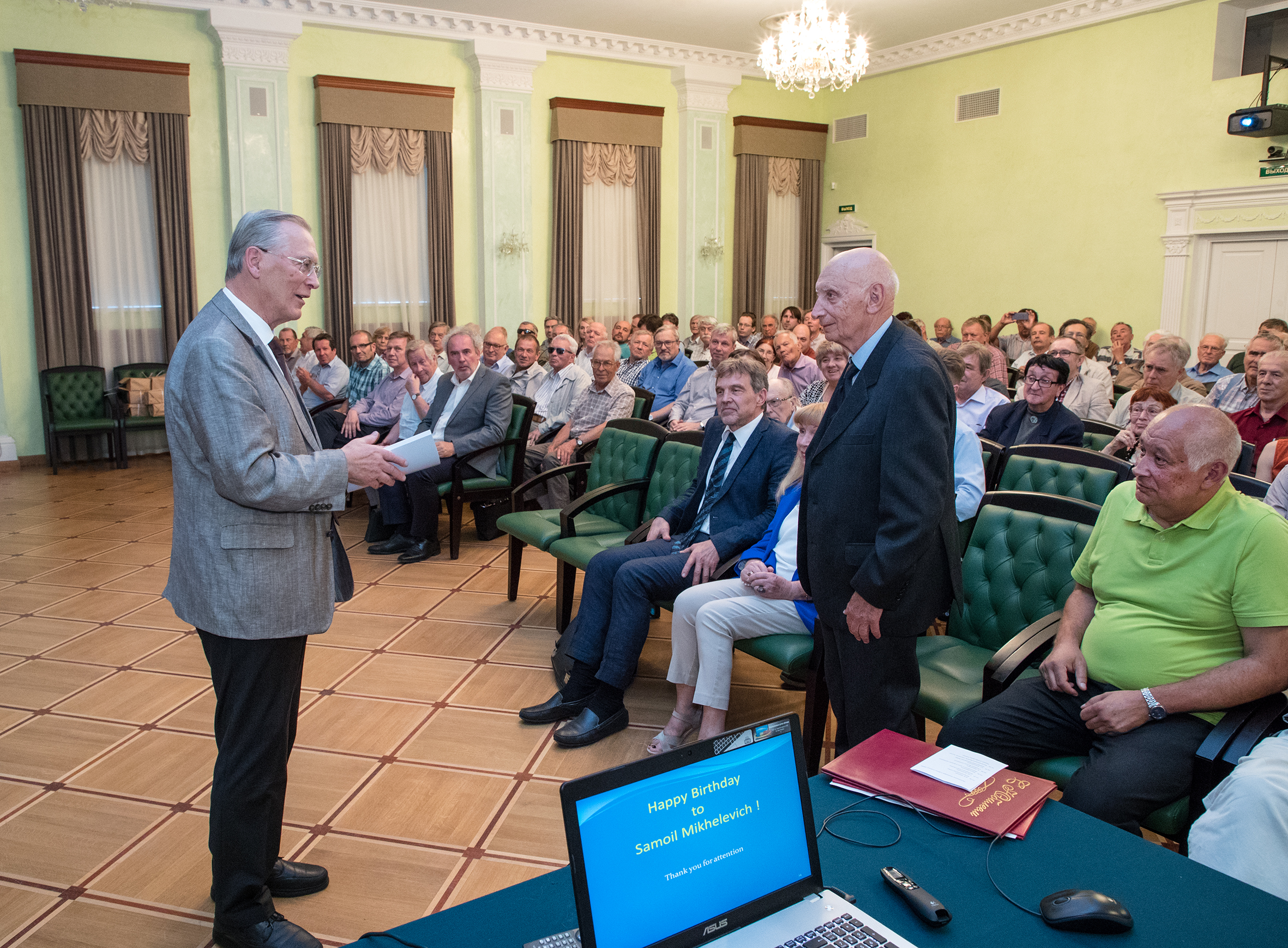 А завершило эту часть семинара теплое и искреннее поздравление от директора ОИЯИ академика В.А. Матвеева, который вручил юбиляру посвященный ему фотоальбом, отпечатанный в Издательском отделе ОИЯИ и подготовленный сотрудниками научно-информационнного отдела. На последовавшем вслед за научной частью семинара фуршете друзья, коллеги, ученики юбиляра отмечали человеческие качества Самоила Михелевича, его интеллигентность и скромность, неизменную вежливость, доброжелательность и готовность обсудить любые проблемы (необязательно научные), его невероятную работоспособность и способность искренне радоваться успехам друзей и коллег.