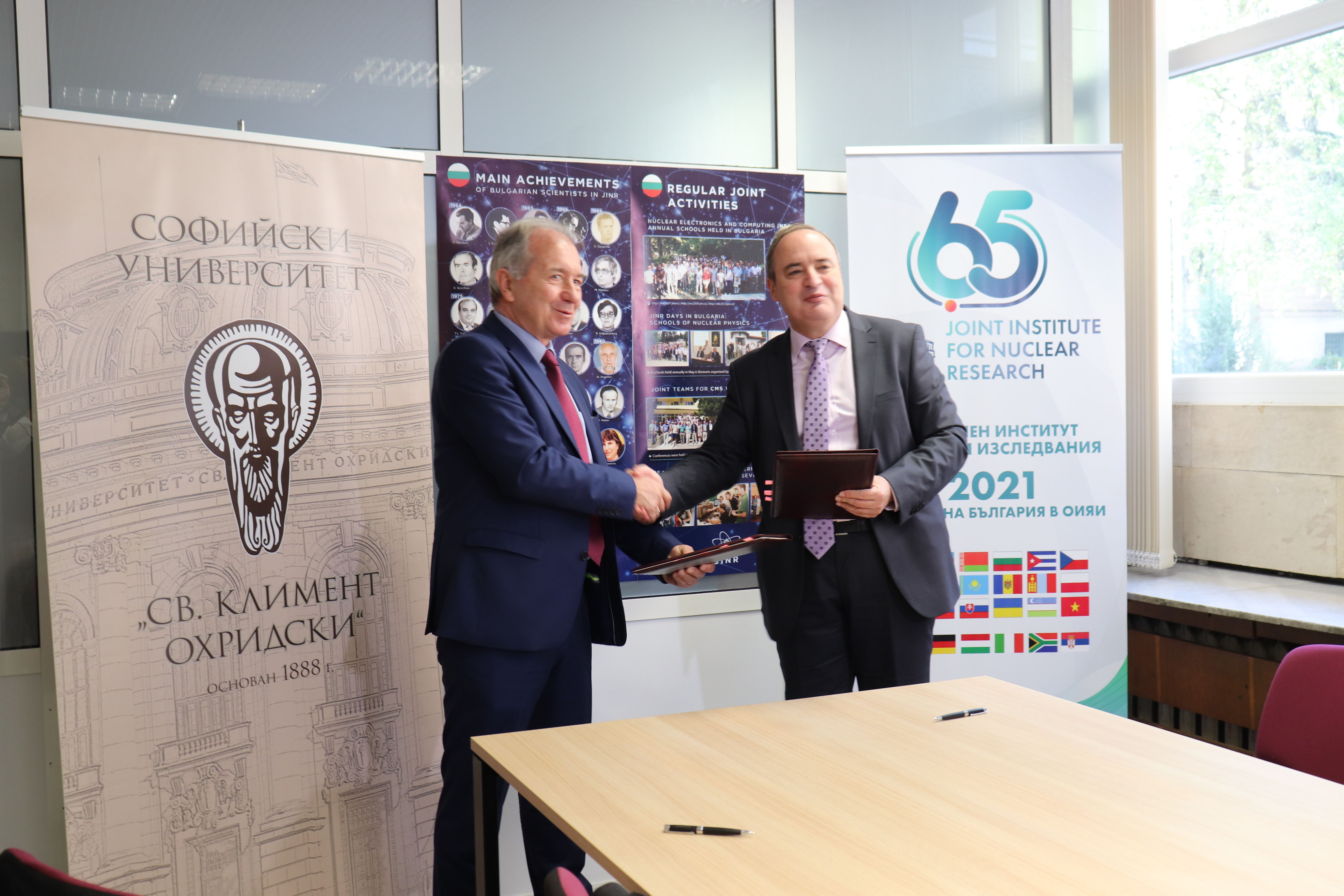 16 сентября начал свою работу первый в Евросоюзе Информационный центр ОИЯИ, торжественно открытый на базе Физического факультета Софийского университета им. Св. Климента Охридского. Выступая на открытии Инфоцентра, глава Департамента международного сотрудничества ОИЯИ Дмитрий Каманин рассказал о развитии сети информационных центров ОИЯИ и их работе, направленной на популяризацию деятельности ОИЯИ, его возможностей и достижений, а также на привлечение в науку молодежи, в том числе на этапе школьного образования. Он подчеркнул, что работа информационного центра способна внести существенный вклад в дальнейшее развитие международного сотрудничества. Важной составляющей деятельности ИЦ ОИЯИ является образовательное направление, и о его развитии на базе ИЦ в Софии рассказал директор Учебно-научного центра ОИЯИ Станислав Пакуляк. В рамках открытия ИЦ Лъчезаром Костовым и ректором Софийского университета им. Св. Климента Охридского проф. Атанасом Герджиковым были подписаны соглашения, направленные на расширение сотрудничества ОИЯИ и Софийского университета в научно-исследовательской и инновационной деятельности, подготовке кадров, популяризации естественных наук: «Соглашение об открытии Информационного центра ОИЯИ» и «Соглашение о сотрудничестве в научно-исследовательской деятельности и подготовке кадров». Открытие Информационного центра в Софийском университете освещалось первым каналом Болгарского национального телевидения.