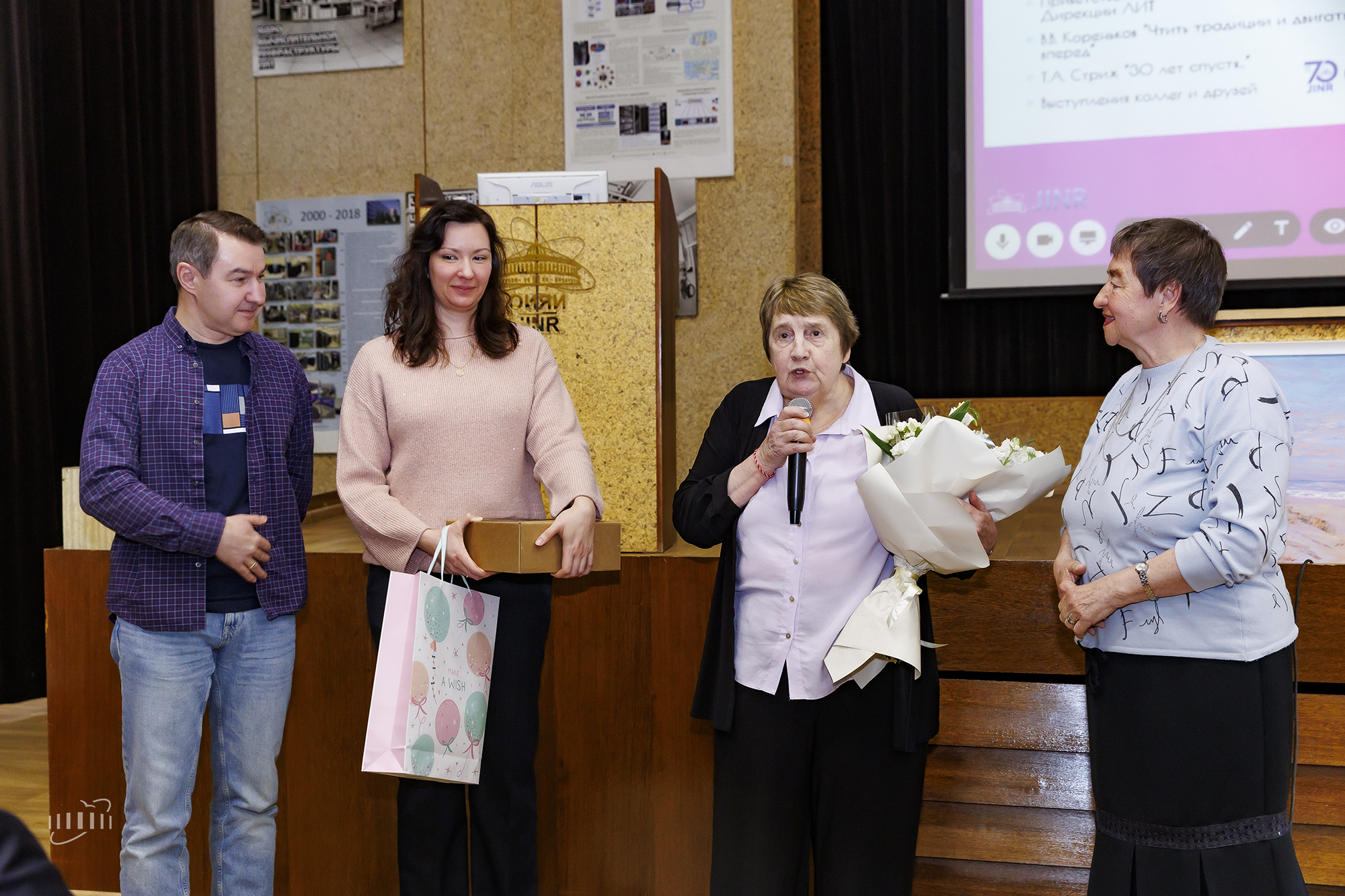 Директор ОИЯИ Григорий Трубников отметил, что у каждого человека на протяжении жизненного пути появляется множество учителей – как в области профессиональных знаний, так и в житейском отношении, влияющих на мировосприятие человека. Григорий Трубников признался, что Татьяна Стриж стала для него одним из таких наставников, и тепло поздравил ее с круглой датой.