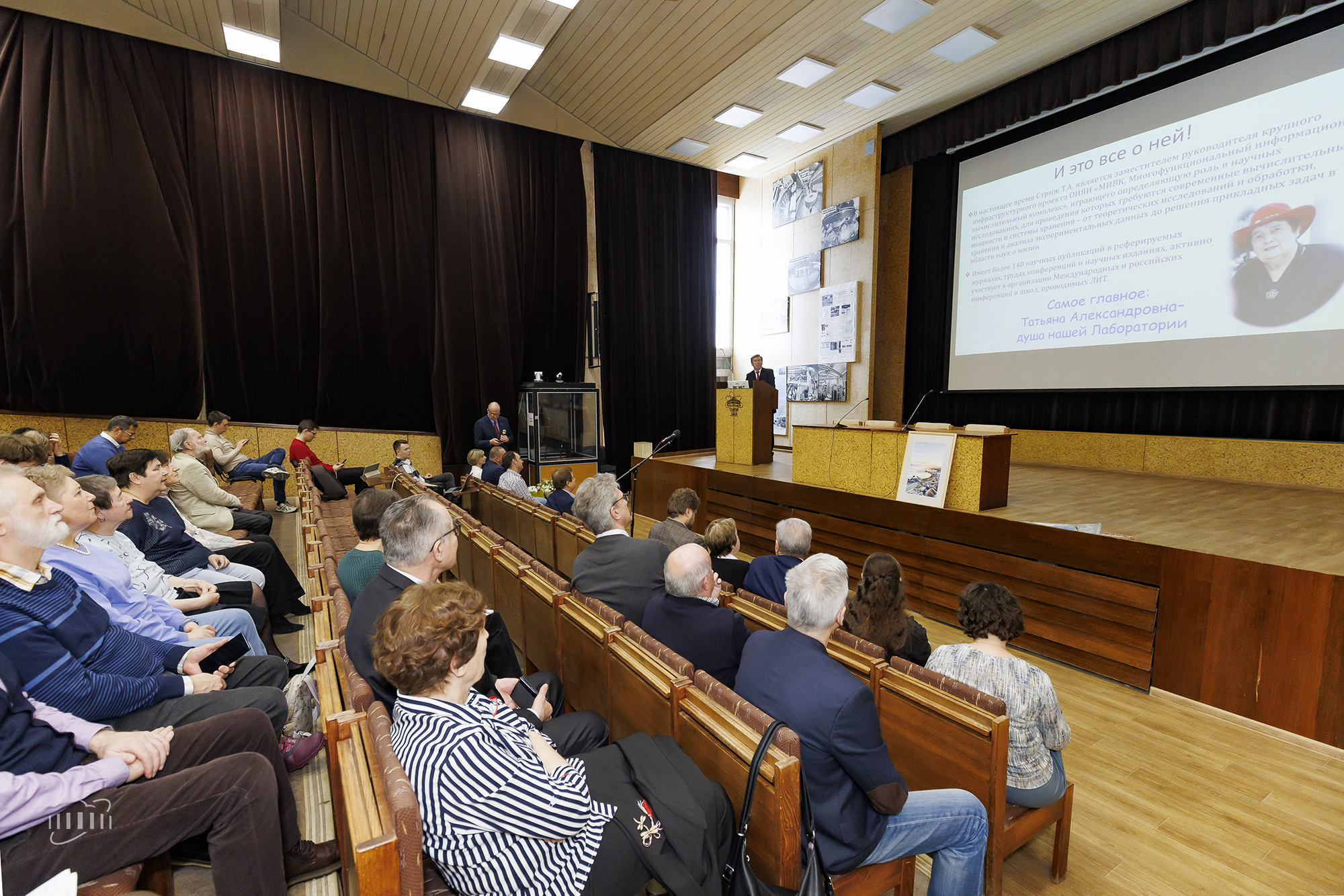 В рамках семинара прозвучало два доклада. Татьяна Стриж рассказала о многолетнем опыте проведения крупных конференций по распределенным вычислениям, математическому моделированию, вычислительной физике и другим направлениям, организованных силами лаборатории, а также о сохранении научного наследия ЛИТ – подготовке книг-альбомов, посвященных памяти основателей лаборатории и ее 60-летней истории. Научный руководитель ЛИТ Владимир Кореньков представил доклад «Чтить традиции и двигаться вперед» об основных вехах биографии именинницы.