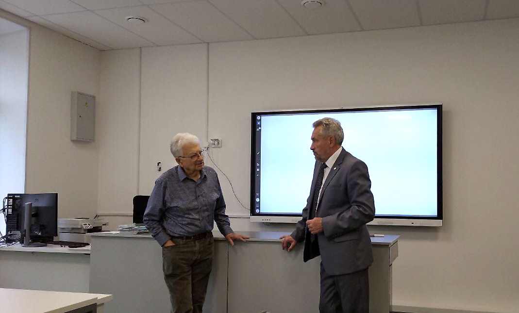 Introducing the guest to the Lyceum, Yuri Kurlapov showed him around classrooms, in particular, accompanied by an IT teacher Vladislav Kuzmin, Yuri Tsolakovich had a look at equipping of IT, Physics, and Foreign Languages classrooms. In a classroom for laboratory works on physics, Yuri Oganessian left his autograph on the interactive touch board. At the end of the visit, Yuri Tsolakovich met with senior school students of the Lyceum (students of the inly 9th grade and both 10th grades, namely with the chemical-physical and IT grades).