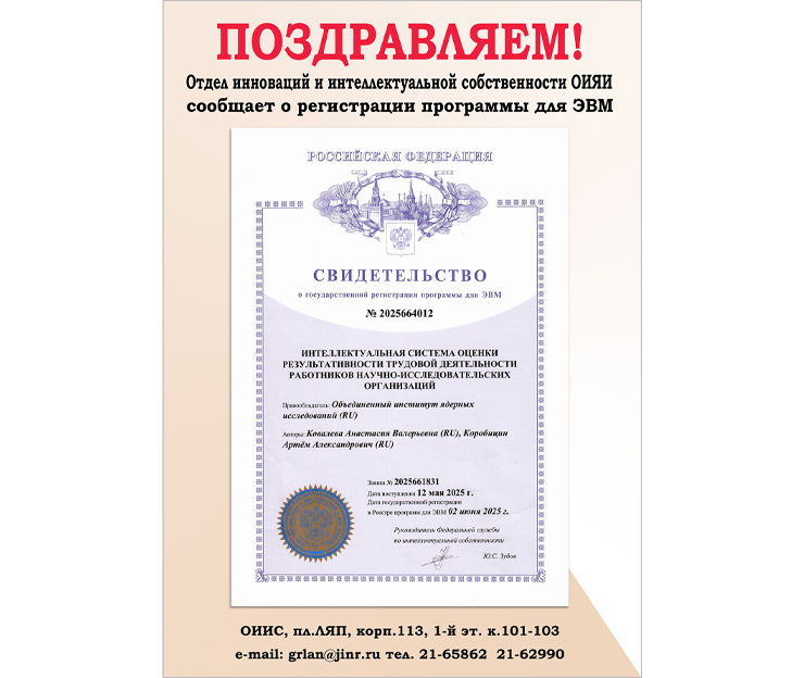 Отдел инноваций и интеллектуальной собственности ОИЯИ сообщает, что 2 июня 2025 года Объединенным институтом ядерных исследований было получено свидетельство о государственной регистрации интеллектуальной системы оценки результативности трудовой деятельности работников научно-исследовательских организаций. Авторы — Анастасия Ковалева (Департамент кадров и делопроизводства) и Артем Коробицин (ЛФВЭ).
