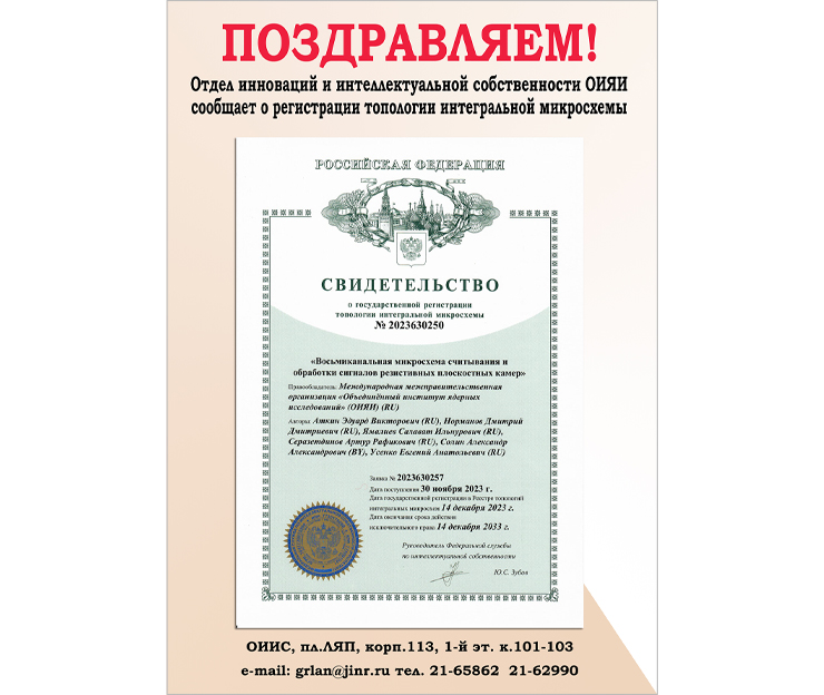 Отдел инноваций и интеллектуальной собственности ОИЯИ сообщает, что 14 декабря 2023 года Объединенным институтом ядерных исследований было получено свидетельство о государственной регистрации топологии интегральной микросхемы №2023630250 «Восьмиканальная микросхема считывания и обработки сигналов резистивных плоскостных камер». Одним из авторов является Евгений Анатольевич Усенко, сотрудник Лаборатории физики высоких энергий ОИЯИ.