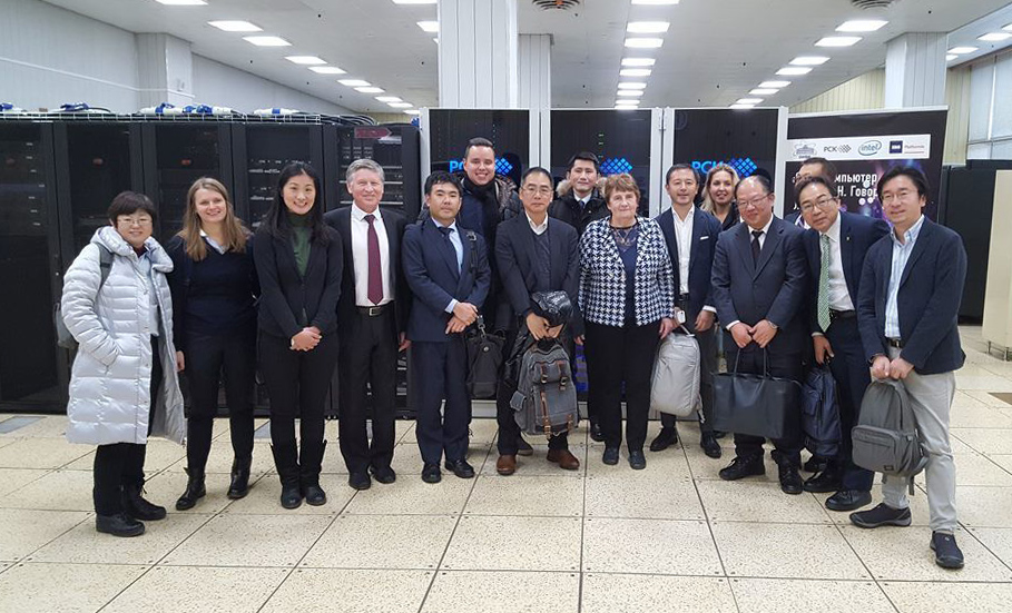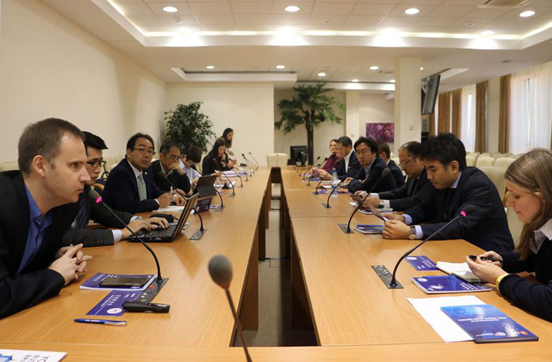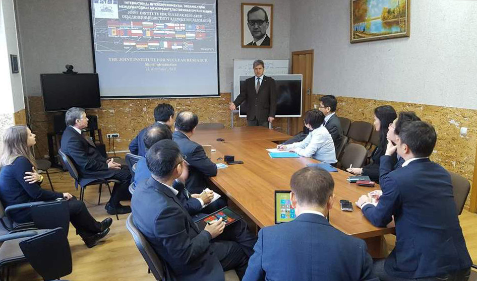 Визит делегации начался в Лаборатории информационных технологий ОИЯИ, где от лица дирекции Института гостей приветствовал заместитель главного ученого секретаря ОИЯИ Д.В. Каманин. Он представил гостям презентацию о деятельности Института, его лабораториях и научных достижениях, уделив особое внимание обширным международным научным связям ОИЯИ и опыту совместной работы в его рамках ученых разных стран, включая Японию.