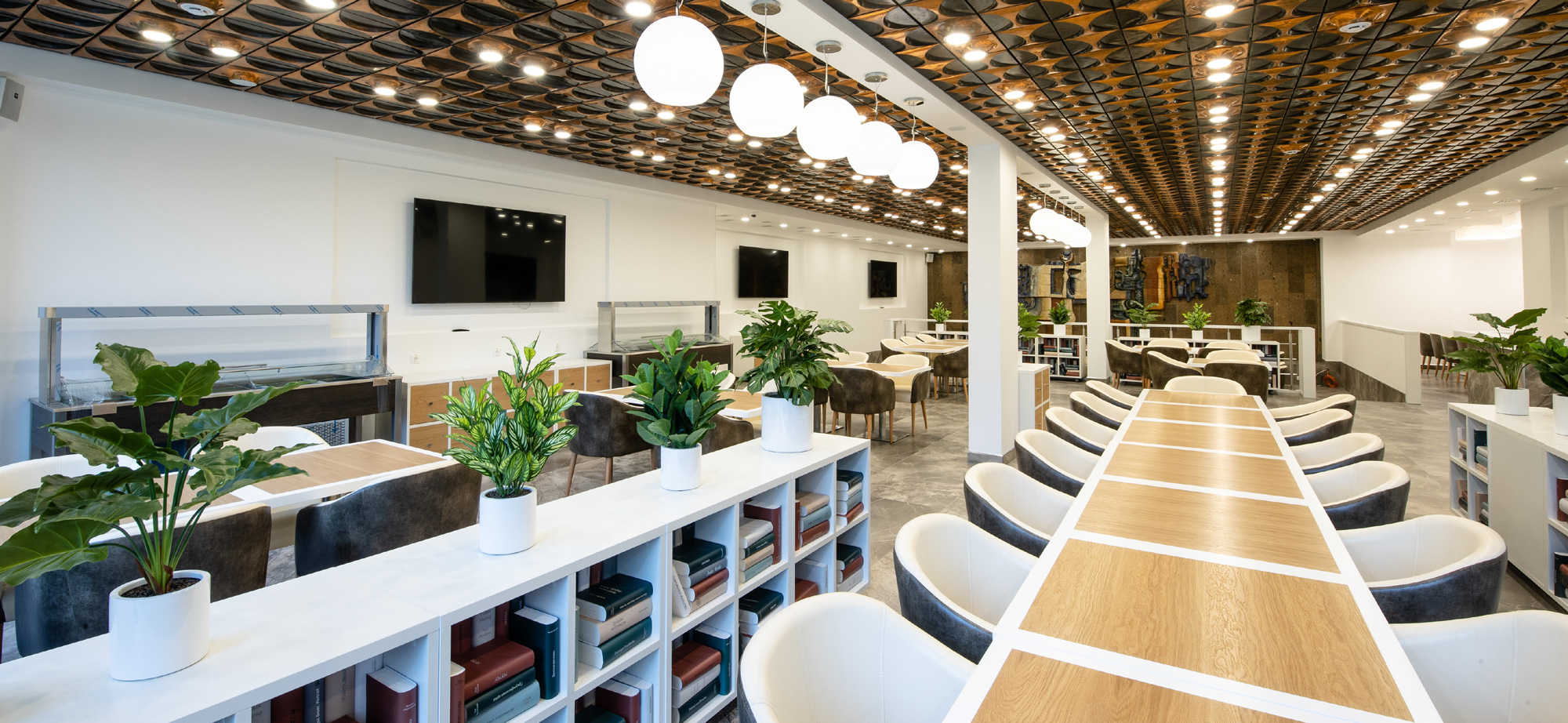 The cafeteria is located on the third floor of the building of the Laboratory on A. Hrynkiewicz alley. The venue is very cosy with a panoramic view of the pine tops.