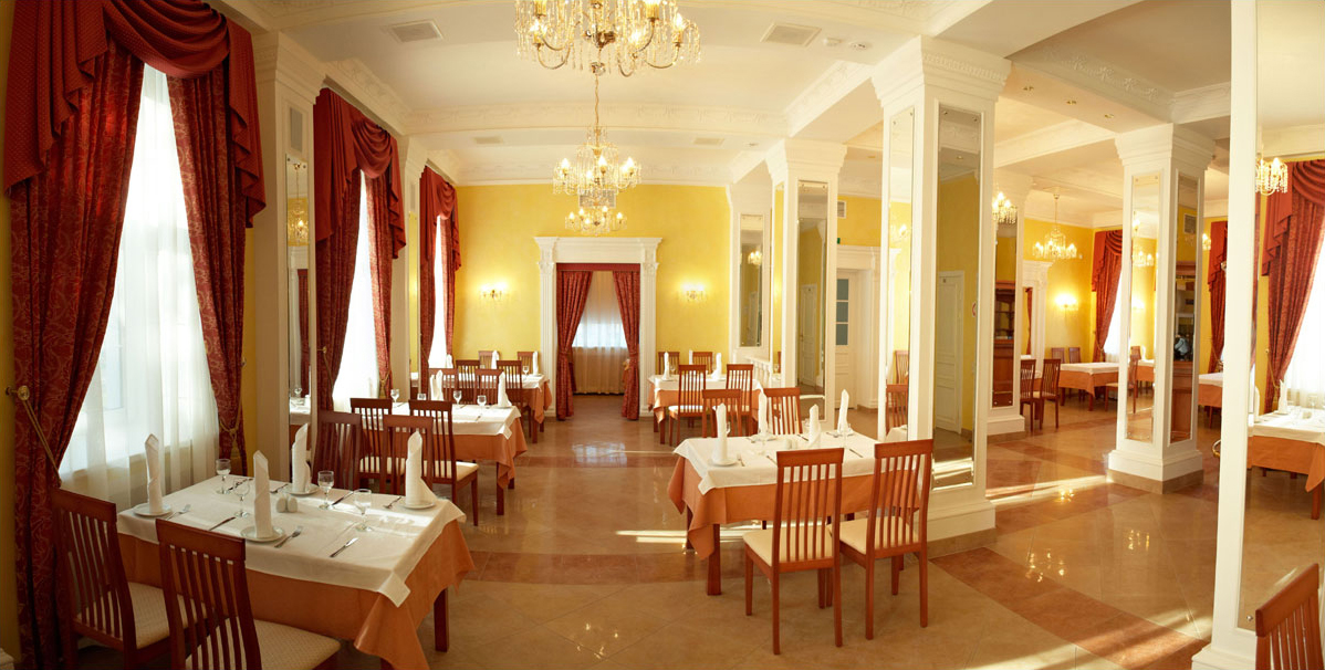 The Café with an elegant interior in the historic part of the city. The building of the Café is a single complex with the JINR Management Building, exactly that most famous building with flags.